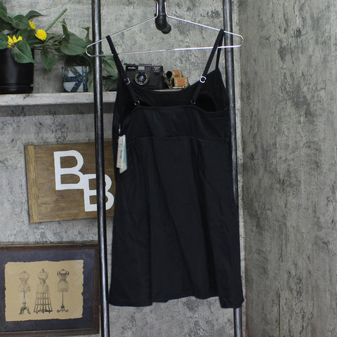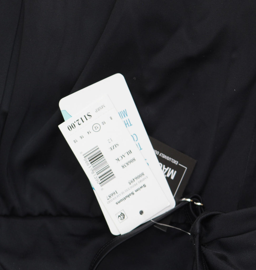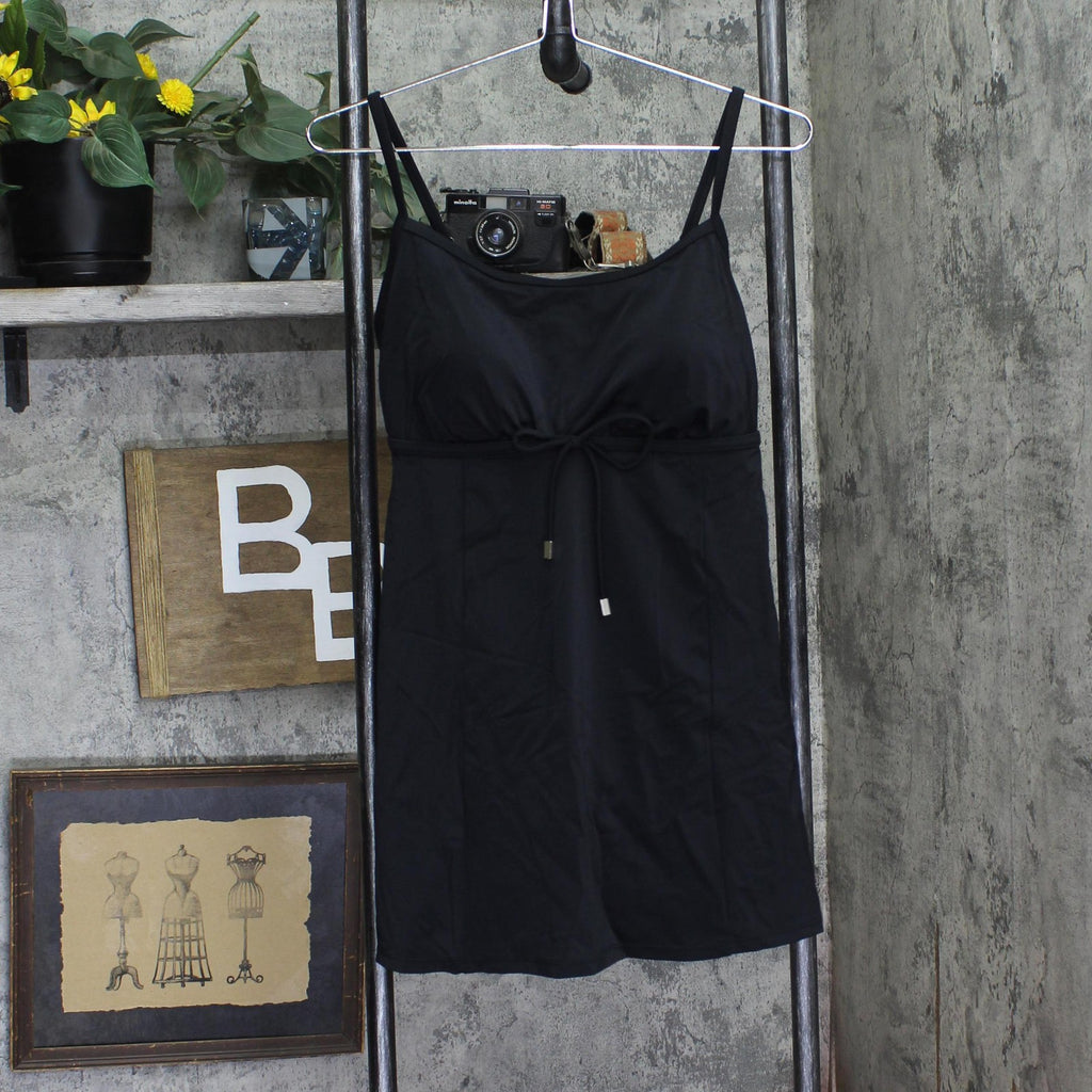 EMPIRE WAIST DESIGN: Features a flattering empire waist silhouette with adjustable drawstring for customizable fit and comfort SWIMDRESS STYLE: Full coverage swimdress with built-in one-piece design perfect for swimming and beach activities ADJUSTABLE STRAPS: Thin spaghetti straps with metal adjusters allow for personalized fit and support VERSATILE COVERAGE: Classic black design offers modest coverage while maintaining a stylish, feminine look SIZING: Available in size 12, designed to provide a comfortable fit with room for movement