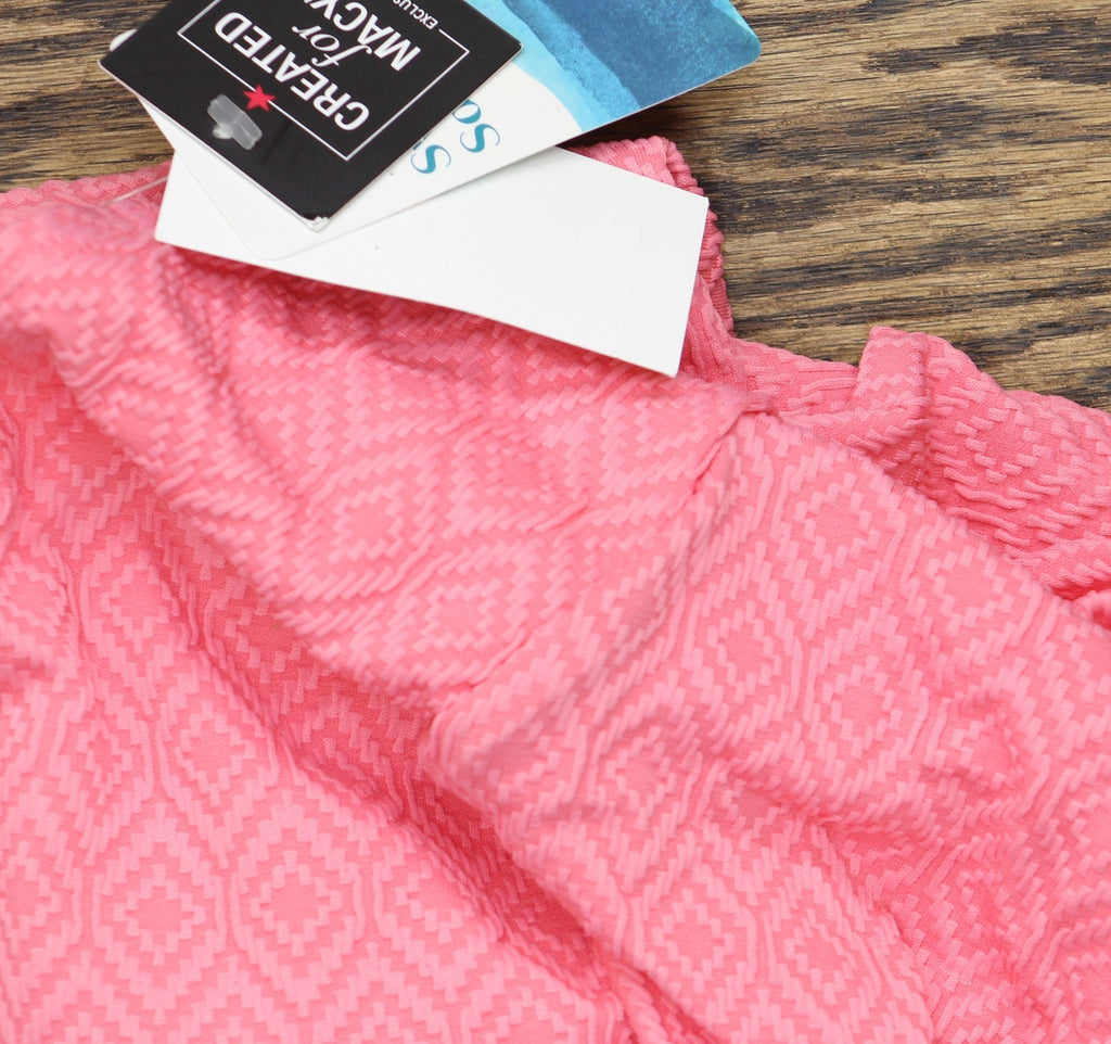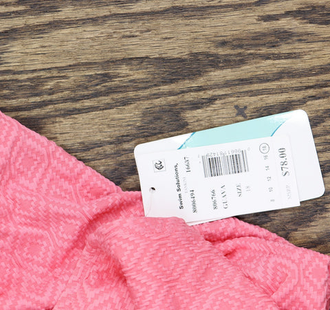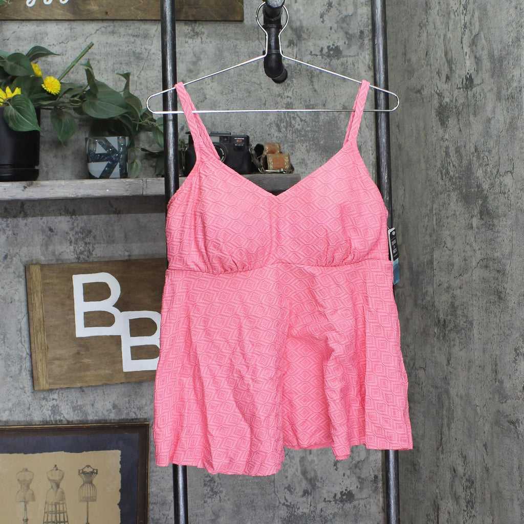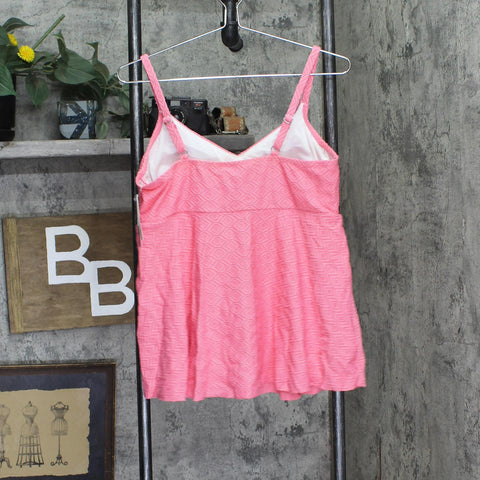 FLATTERING DESIGN: Textured tankini top with underwire support provides shaping and comfort while the empire waist creates a feminine silhouette PREMIUM FABRIC: Features a textured geometric pattern in beautiful guava pink that adds visual interest and style to this swimwear piece SUPPORTIVE FIT: Built-in underwire provides excellent bust support and shaping, while adjustable straps ensure a customized fit VERSATILE STYLE: Perfect for swimming, beach days, or poolside lounging, this tankini top pairs easily with any swim bottom SIZE & STYLE: Available in size 18, this tank-style swim top offers full coverage with a flattering v-neckline and empire waist design