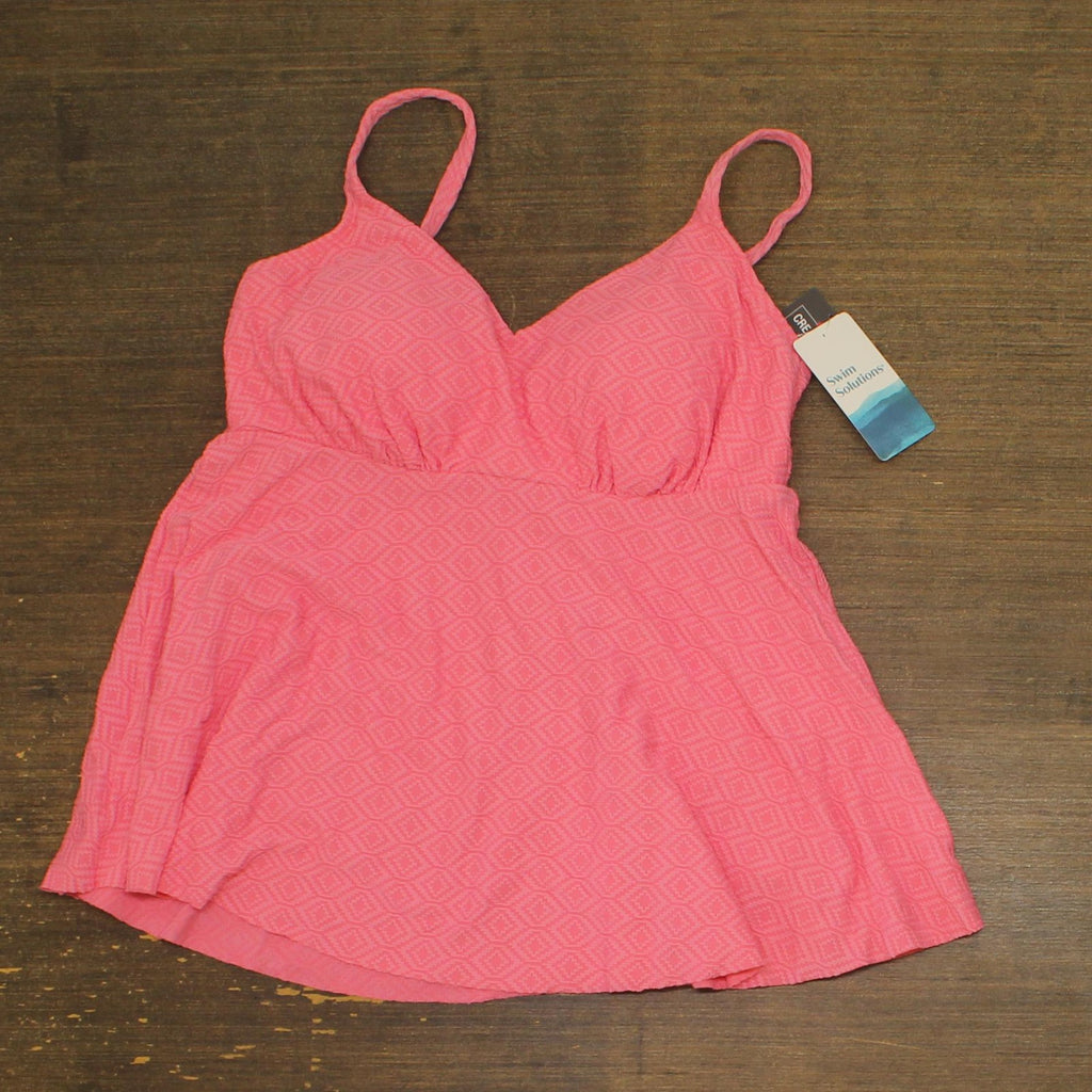 TEXTURED DESIGN: Flattering diamond pattern textured fabric creates visual interest and dimension in a feminine guava pink shade UNDERWIRE SUPPORT: Built-in underwire provides excellent bust support and shaping while maintaining comfort TANKINI STYLE: Empire waist silhouette with flared hem offers graceful coverage and a figure-flattering fit ADJUSTABLE STRAPS: Customizable shoulder straps ensure a perfect fit and optimal support for various body types VERSATILE FIT: V-neckline and princess seams create a shapely silhouette that pairs perfectly with any swim bottom