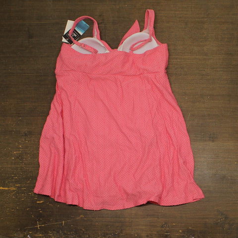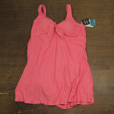 Make a stylish splash in this flattering Swim Solutions swimdress. The textured fabric features an elegant diamond pattern throughout in a beautiful guava pink shade. The feminine silhouette includes a graceful tie-front detail at the bust and adjustable shoulder straps for a customized fit. The swimdress design offers comfortable coverage while maintaining a flirty look, with a slightly flared skirt that floats elegantly around the hips. The V-neckline and empire waist create a figure-enhancing effect, while the built-in support provides comfort for all-day wear. Perfect for beach days, pool parties, or resort vacations, this swimdress combines fashion with functionality. The textured material adds visual interest while maintaining its shape in and out of the water. Available in size 18, this swimdress is designed to help you feel confident and comfortable during your water activities.