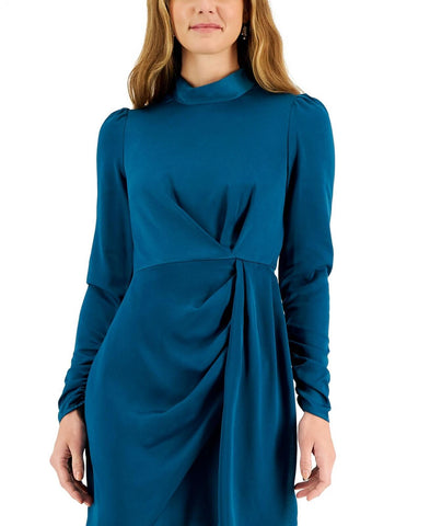 A sophisticated spin on party style, this Taylor mock neck dress is softened with pleating at the drapey side and ruching at the long sleeves.