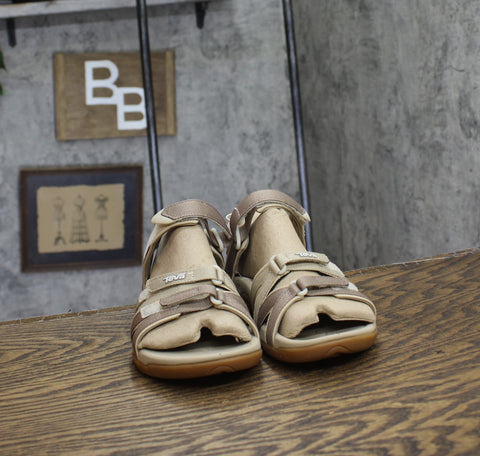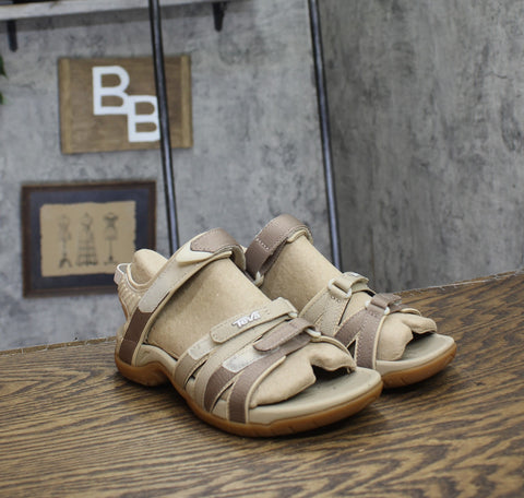 Vibrantly colored webbing with three hook-and-loop straps secures the fit of a performance-minded water sandal. The grippy Spider Original sole ensures traction on every surface. 1" heel; 3/4" platform (size 9) Cushioned Shoc Pads absorb impact. Synthetic and textile upper/textile lining/rubber sole. By Teva; imported. BP. Shoes.
