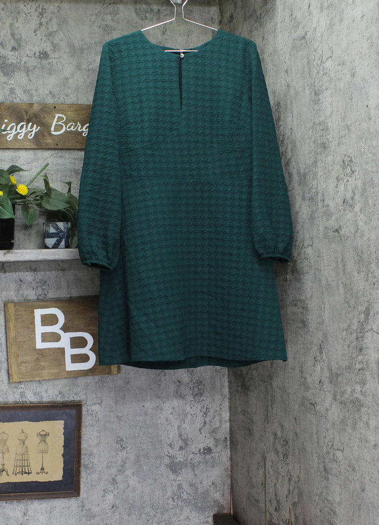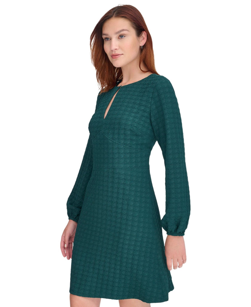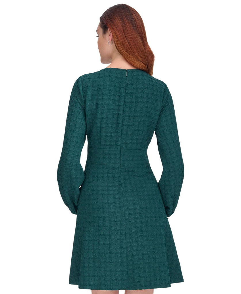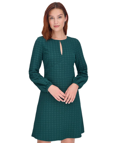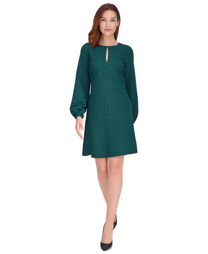 Embossed houndstooth patterning elevates the texture and tone of this keyhole-neck dress from Tommy Hilfiger. It's a go-to look that will take you to a party in style. Features Approx. model height is 5'10" and she is wearing a size 6 Approx. 35" long from center back neck to hem. Length is based on size 6 and varies 1/4" between sizes. Round neck with logo button at keyhole Fit & Flare: Fitted through the chest and waist; flared and flowing skirt Embossed houndstooth knit fabric Back hidden zip closure Wide waistband with chevron seaming at front Long balloon sleeves with logo buttons at cuffs Partially lined 96% polyester, 5% spandex; bodice lining: 100% polyester Dry clean Imported