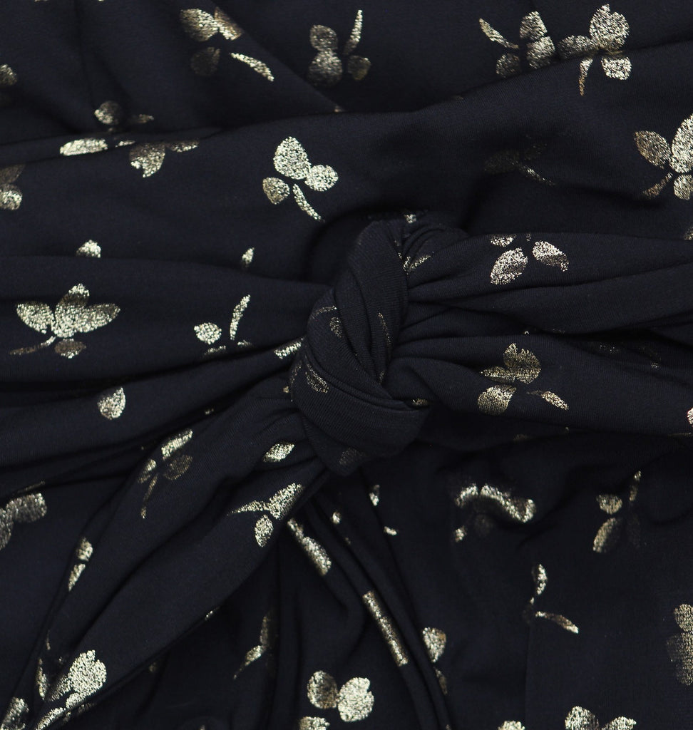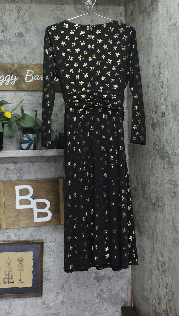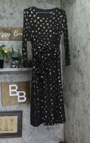 A subtly shimmering print lends a sleek style to this charming fit & flare dress by Tommy Hilfiger. Features Approx. 45" long from center back neck to hem. Length is based on size 6 and varies 1/4" between sizes Fitted through the chest and waist; flared and flowing skirt Jersey-knit: Soft and stretchy Round neckline; Fit & flare silhouette Back zip closure 3/4-sleeves Floral print; ruched waist Lined 95% polyester, 5% spandex; lining: 100% polyester Dry clean Imported