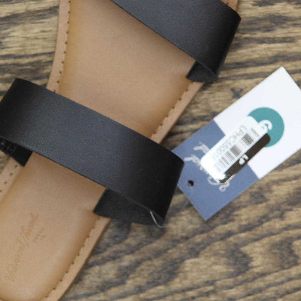 Adorn your feet with sleek style with these Freya Two-Band Slide Sandals from Universal Thread. These slip-on slide sandals feature a breezy open toe and back and an elastic double band on top for a stay-put fit. Universal Thread two-band slide sandals Contoured footbed Cushioned insole Elastic panel Open square toe Slip-on style Sizing: Womens Construction: Contoured Footbed, Elastic Panel, Cushioned Insole Footwear Insole Material: 100% Polyurethane Features: Slip On Care and Cleaning: Air Dry Footwear Lining Material: 100% Polyurethane Toe Style: Square Toe Footwear Upper Material: 100% Polyurethane Heel: No Heel Footwear Outsole Material: 100% TPR (Thermoplastic Rubber) Shoe Width: Medium Footwear toe openness: Open Toe Footwear outsole details: Flexible Outsole