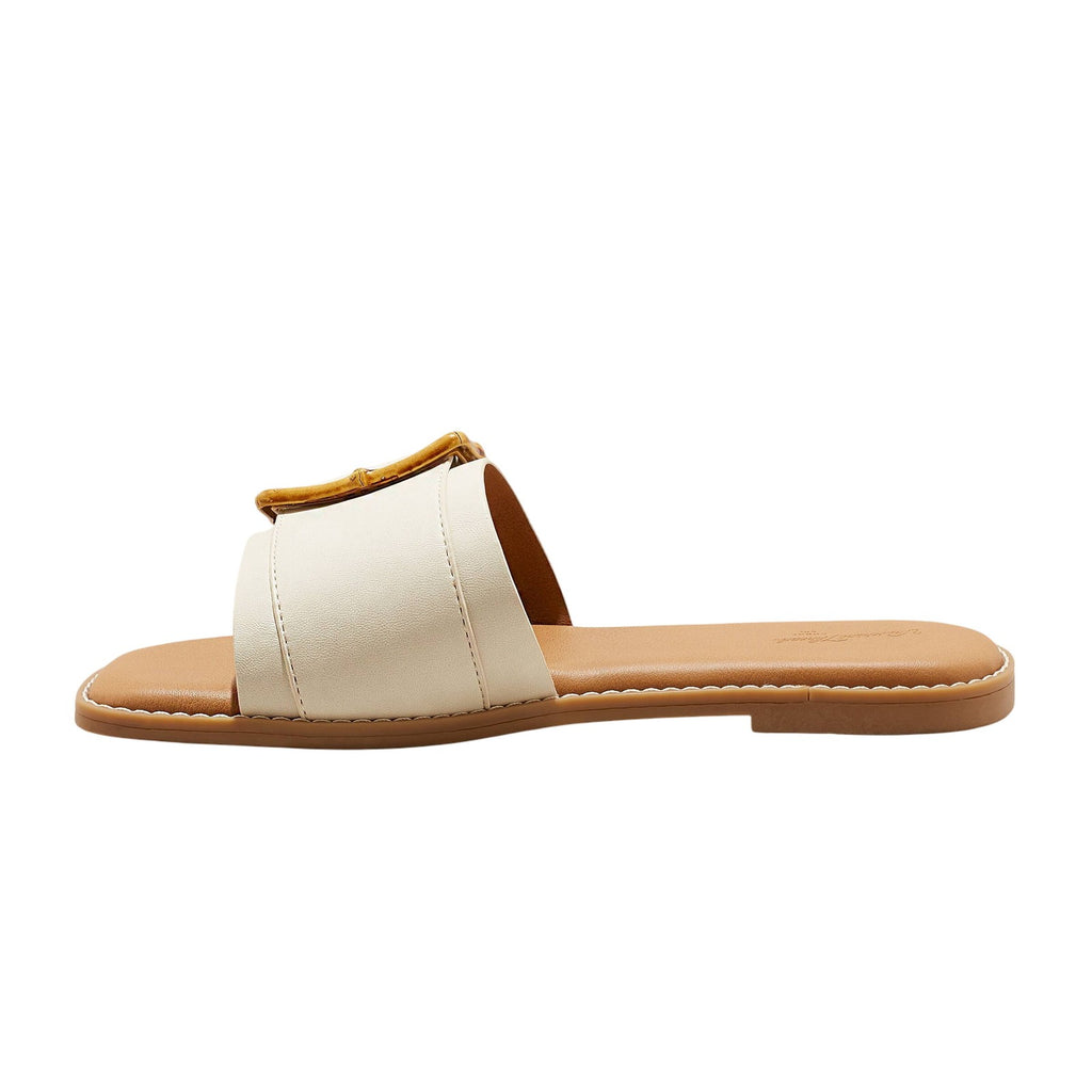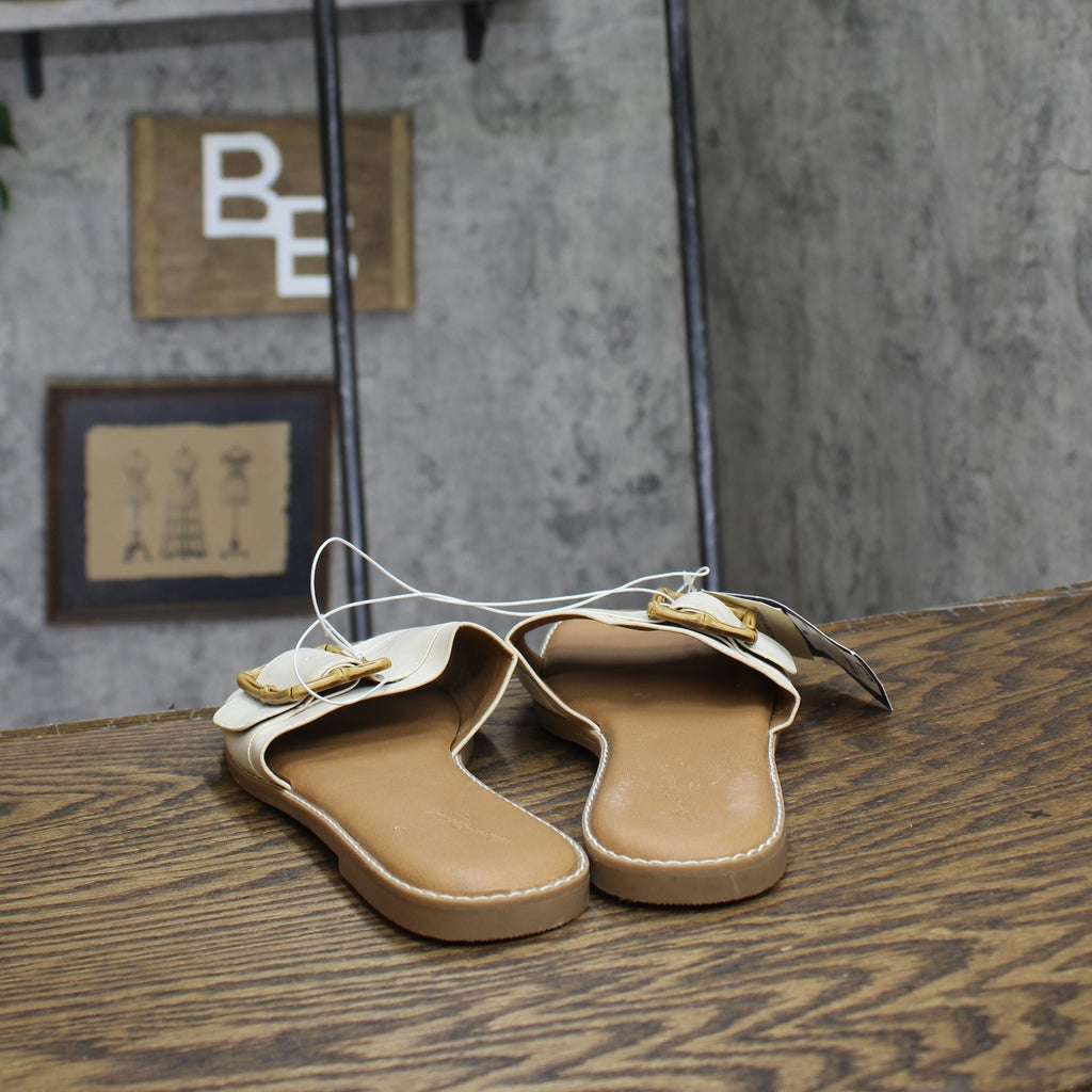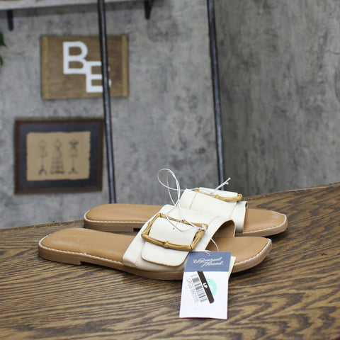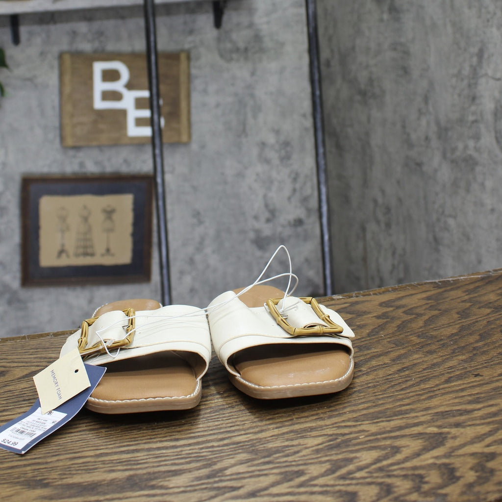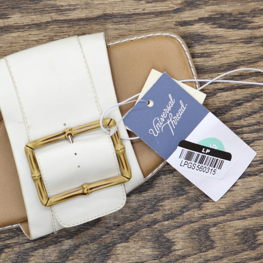 Add fashion-forward flair to your warm-weather ensembles with these Gene Slide Sandals from Universal Thread. The simple yet stylish medium-width sandals feature a memory foam insole construction to help keep you walking in comfort and come complete with a rectangle buckled wide vamp band for additional style. The slip-on design allows for easy on and off, and the square open-toe and backless silhouette offers cool comfort that goes great with everything from shorts to sundresses. Universal Thread: The denim collection that's true to you. Universal Thread no-heel slide sandals Memory foam insole Wide band upper with rectangle buckle accent Open square-toe and backless design Slip-on style Textured outsole Sizing: Womens Care and Cleaning: Clean With Mild Detergent Footwear Lining Material: 100% Polyurethane Construction: Memory Foam Insole Footwear Insole Material: 100% Polyurethane Features: Slip On Toe Style: Square Toe Footwear Upper Material: 93% Polyurethane and 7% Zinc Alloy Footwear Outsole Material: 100% TPR (Thermoplastic Rubber) Heel: No Heel Shoe Width: Medium Footwear toe openness: Open Toe Footwear outsole details: Textured Outsole