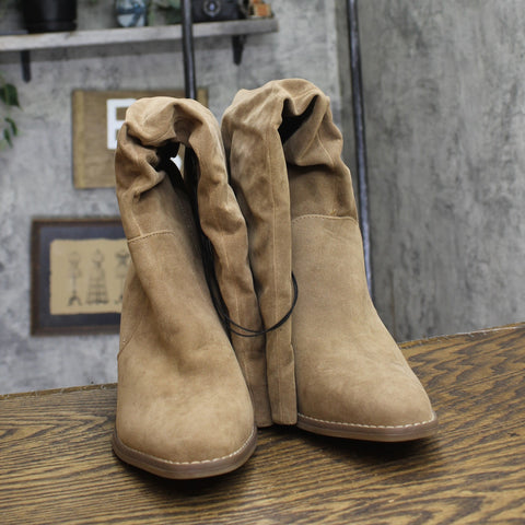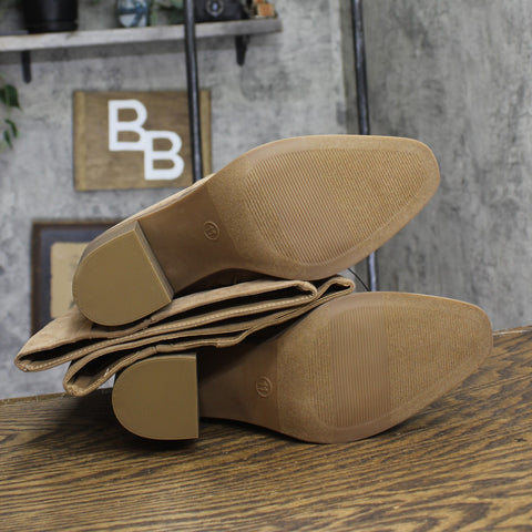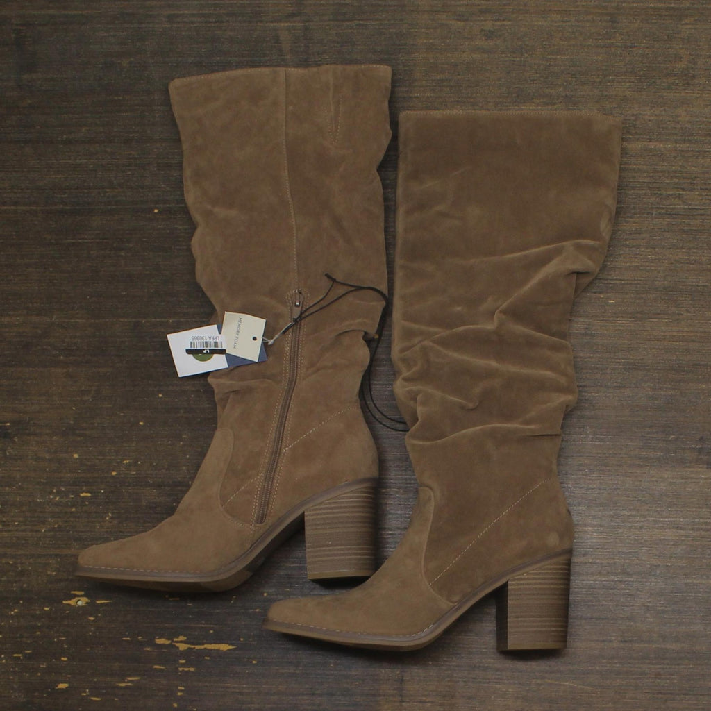 These Harlan Dress Boots from Universal Thread will make all of your winter ensembles stand out thanks to their knee-high scrunched-up silhouette, stylish textured design and versatile taupe color. The medium-width boots have a cushioned footbed, soft lining and insole to keep your feet nice and happy, while the three-inch block heel adds a statement lift to your height. The side zipper allows for easy and secure wear, and the pointed toe completes the design with a chic look. Universal Thread: The denim collection that's true to you.