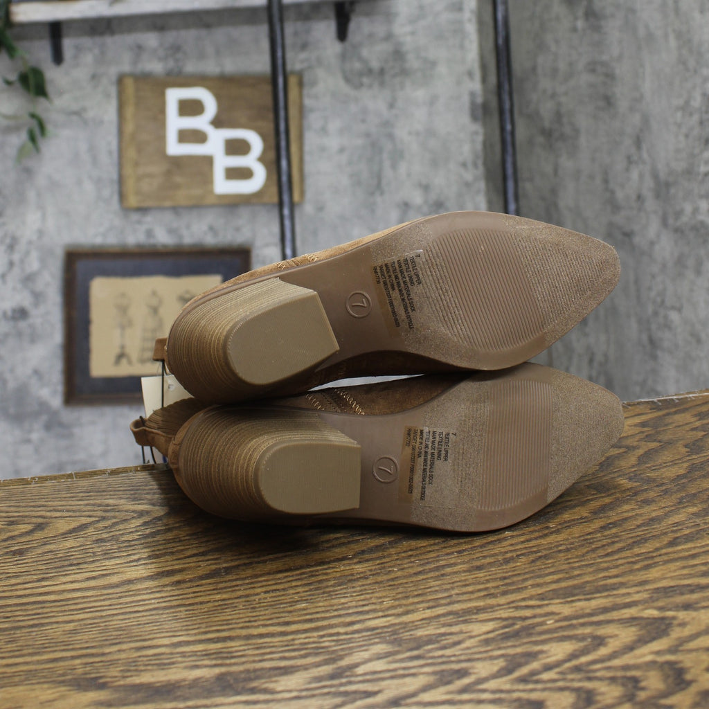 Style a chic look for work, weekends and more with the Kinley Ankle Boots from Universal Thread. These ankle boots feature a western shape with a 3-inch heel and pointed toe, but get a cool and comfortable update with the ribbed fabric cuff at the ankle. A pull loop on the back allows for easier on and off, and the slim shape works well with a variety of dresses, skirts and denim.Universal Thread: The denim collection that's true to you. Universal Thread pull-on ankle boots Approximately 3in western heel Soft fabric cuff at ankle Pointed toe Pull loop for easier on and off Sizing: Womens Care and Cleaning: Brush Away Surface Dirt Footwear Lining Material: 100% Polyester Construction: Pull Loops Footwear Insole Material: 100% Polyurethane Features: Pull-On Height Type: Ankle Toe Style: Pointed Toe Footwear Upper Material: 100% Polyester Footwear Outsole Material: 55% Polyester and 45% TPR (Thermoplastic Rubber) Heel: Approximately 3.0 Inches Western Heel Boot Shaft Circumference: Approximately 10.0 Inches Boot Shaft Height: Approximately 6.0 Inches Shoe Width: Medium Footwear toe openness: Closed Toe Footwear outsole details: Flocked Outsole