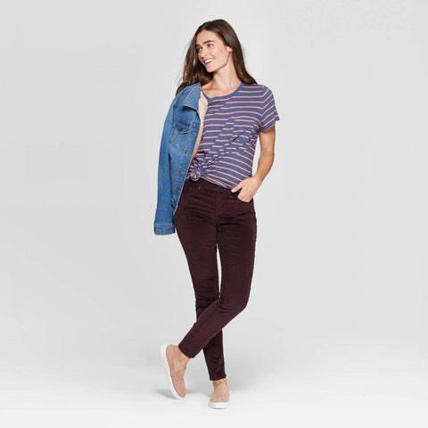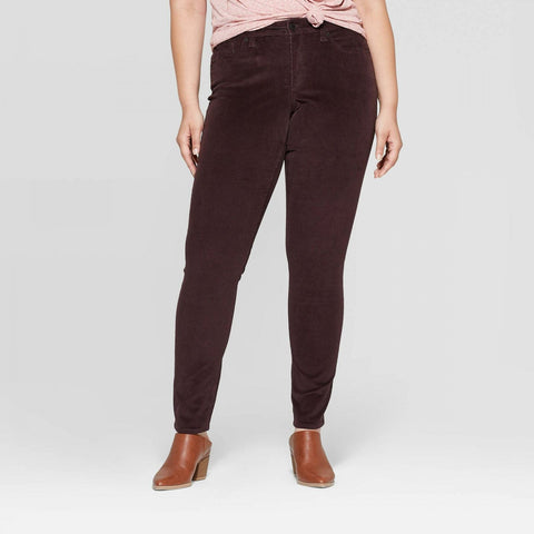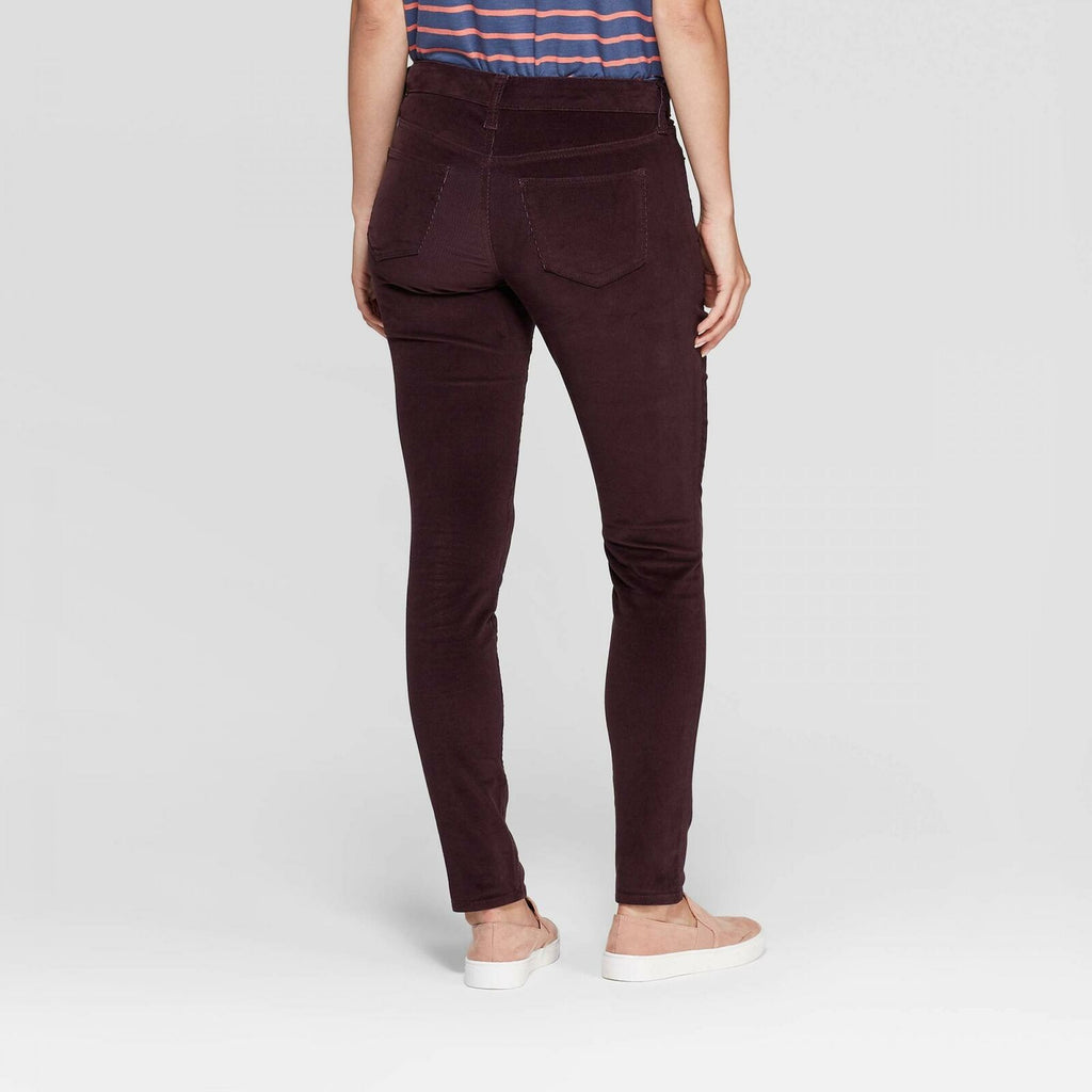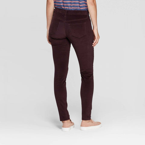 Give your collection of denim extra color and casual-chic flair by adding the Corduroy Mid-Rise Skinny Jeans from Universal Thread. These burgundy skinny jeans feature a corduroy construction that lends a soft feel and retro-like look, great for putting together cool-weather outfits during the fall or winter season. Fitted through the hip and thigh for a figure-flattering silhouette, they're engineered with the perfect fabric weight for comfortable wear, and a redesigned waistband with extra back-rise coverage lends a confident fit. Style yourself a laid-back look with a graphic tee, pair of sneakers and flannel shirt, or dress things up a bit with a half-tucked blouse and heeled booties.