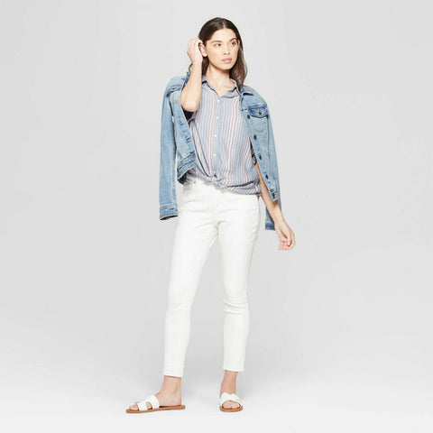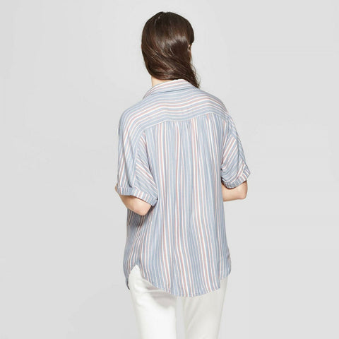 Take on any day in the comfortable and effortless style of this Striped Short-Sleeve Camp Shirt from Universal Thread. Made with 100% rayon for ultimate softness and a lightweight fit, this patterned camp blouse features an allover thin stripe print in white and pink on a muted blue fabric. The elbow-length sleeves with cuff detailing have a loose fit, while the shirt itself drapes and flows over your figure for a relaxed look. With a long hem that's perfect for tucking in and a button-down front for versatile styling, this striped camp blouse is must-have for any fashion-forward wardrobe.