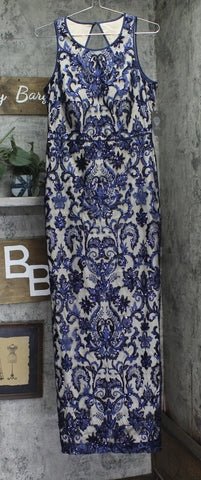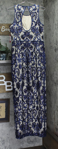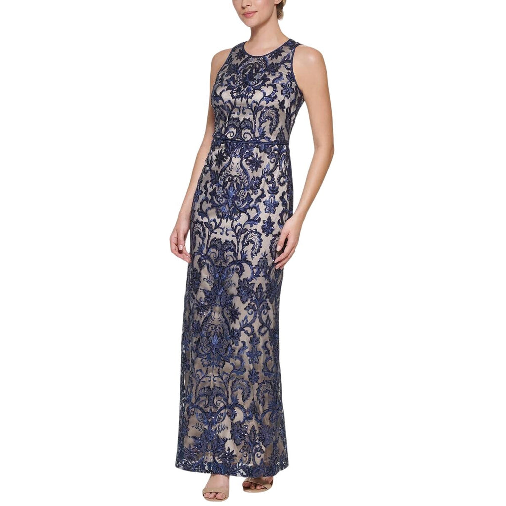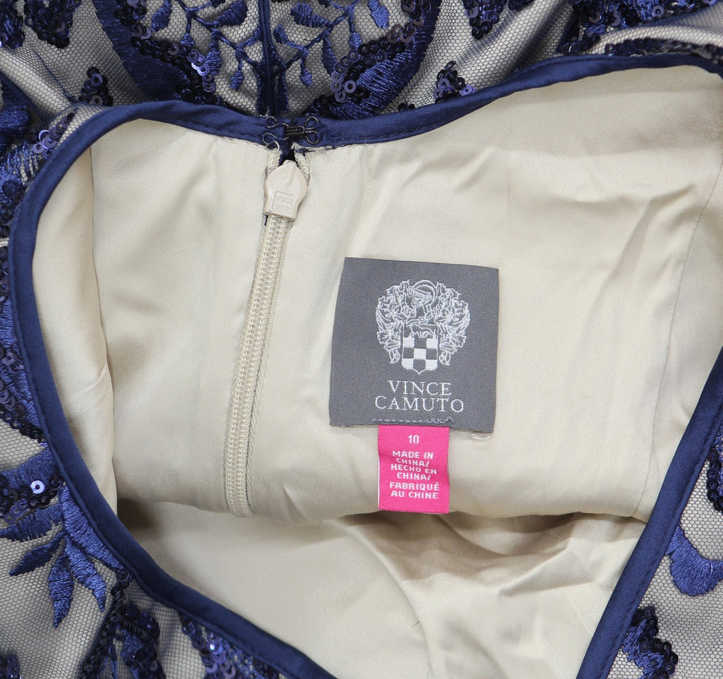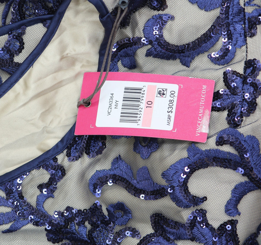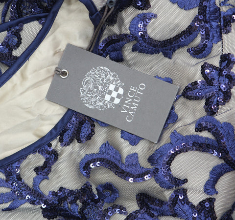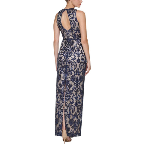 Look extravagant wearing the Vince Camuto Embroidered Sleeves Gown at your next party. Zippered hook-and-eye closure. Crew neckline. Key-hole cut-out back design. Slit on the back.