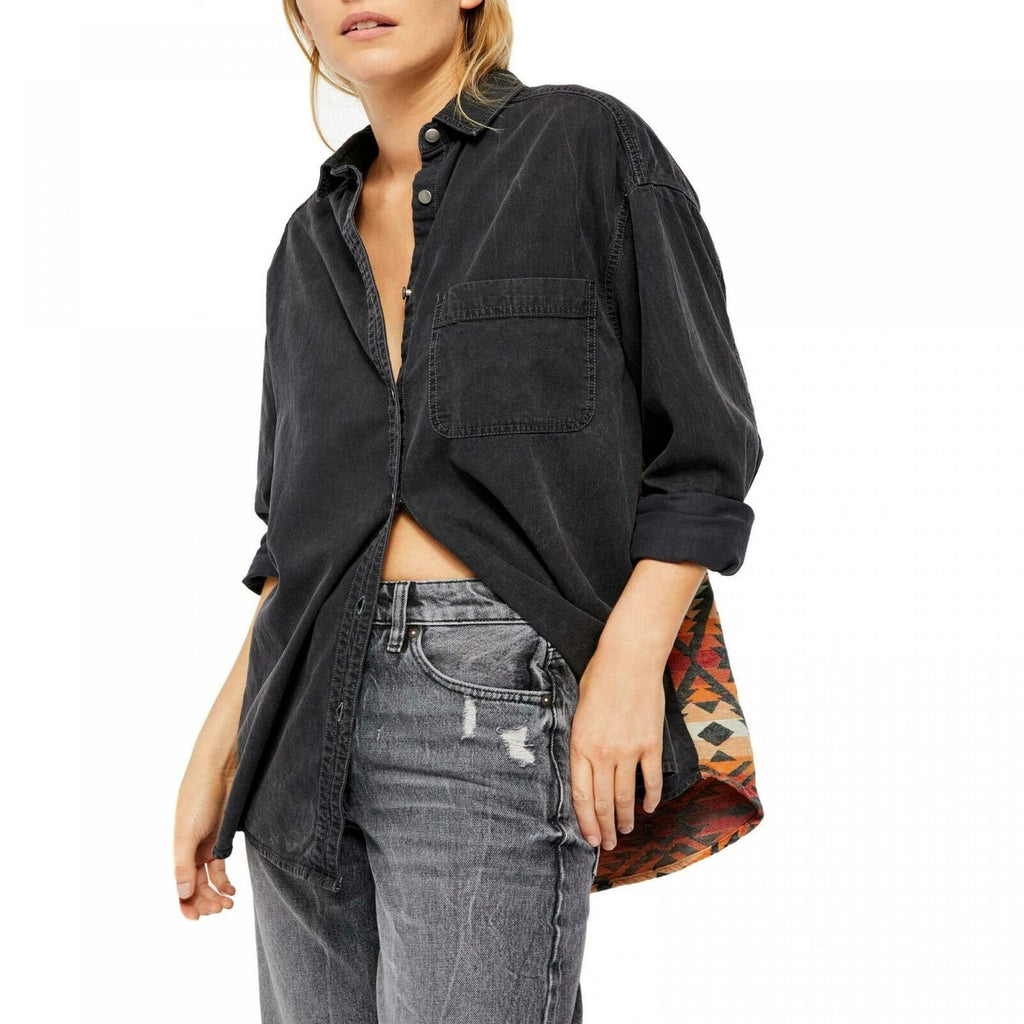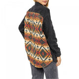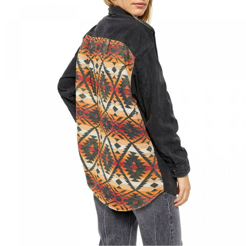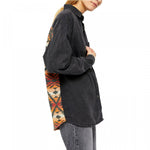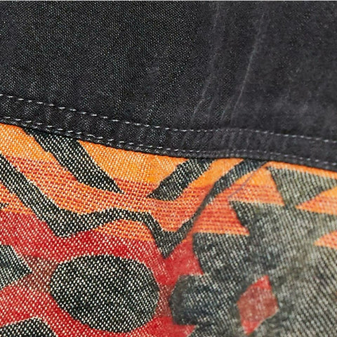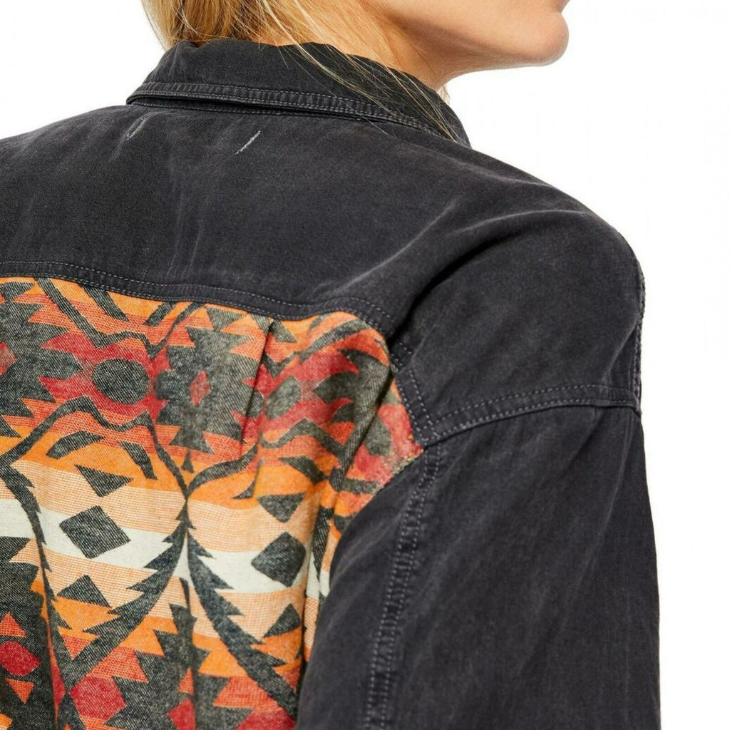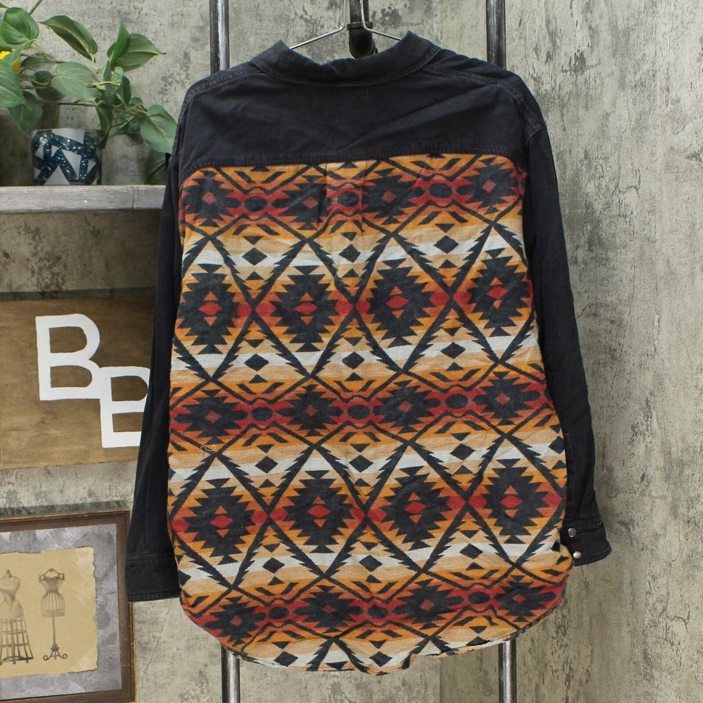 A Southwest-inspired pattern on the back adds an unexpected flourish to a dark-wash denim-chambray shirt.
