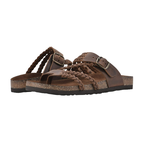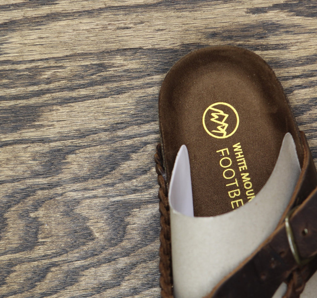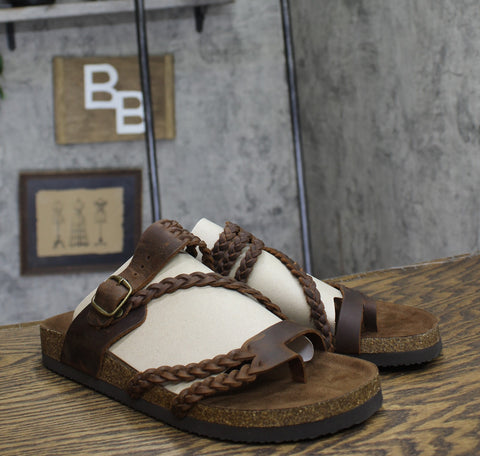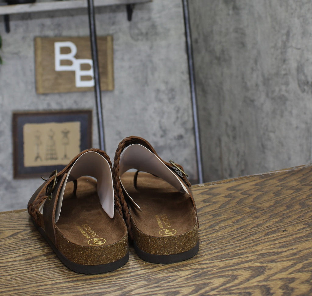 Contoured footbed Adjustable buckle Thong sandal Braided details