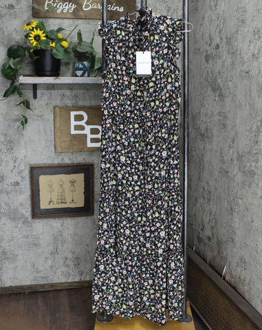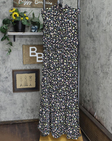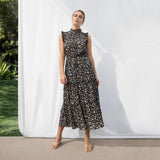 The pretty mini ruffles and sleeveless cut make this dress totally summer-event worthy, while the gathered waist and deep-tier maxi skirt add modest flow that looks great with office layers.