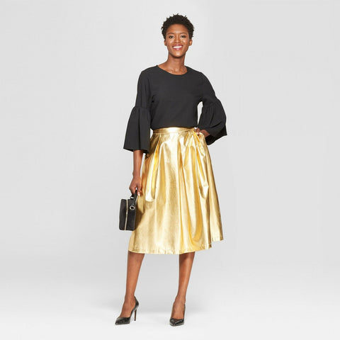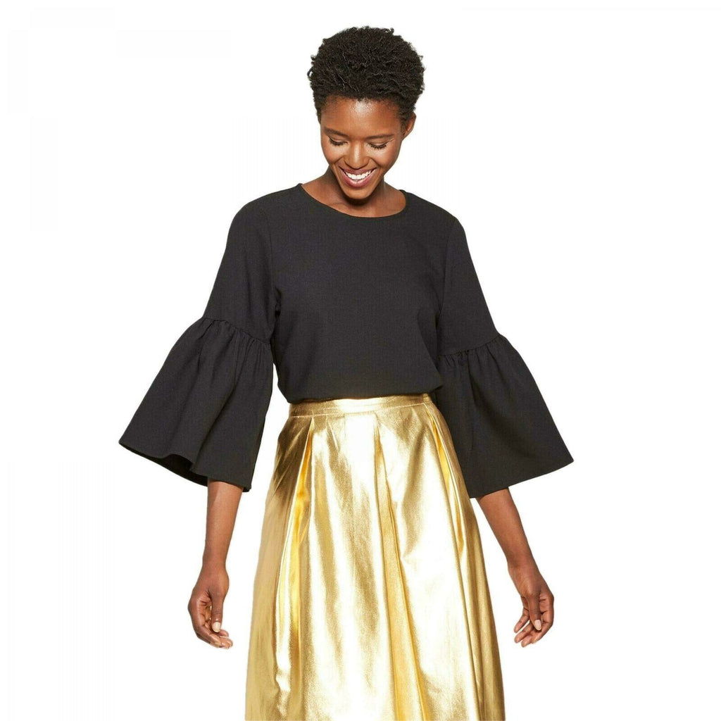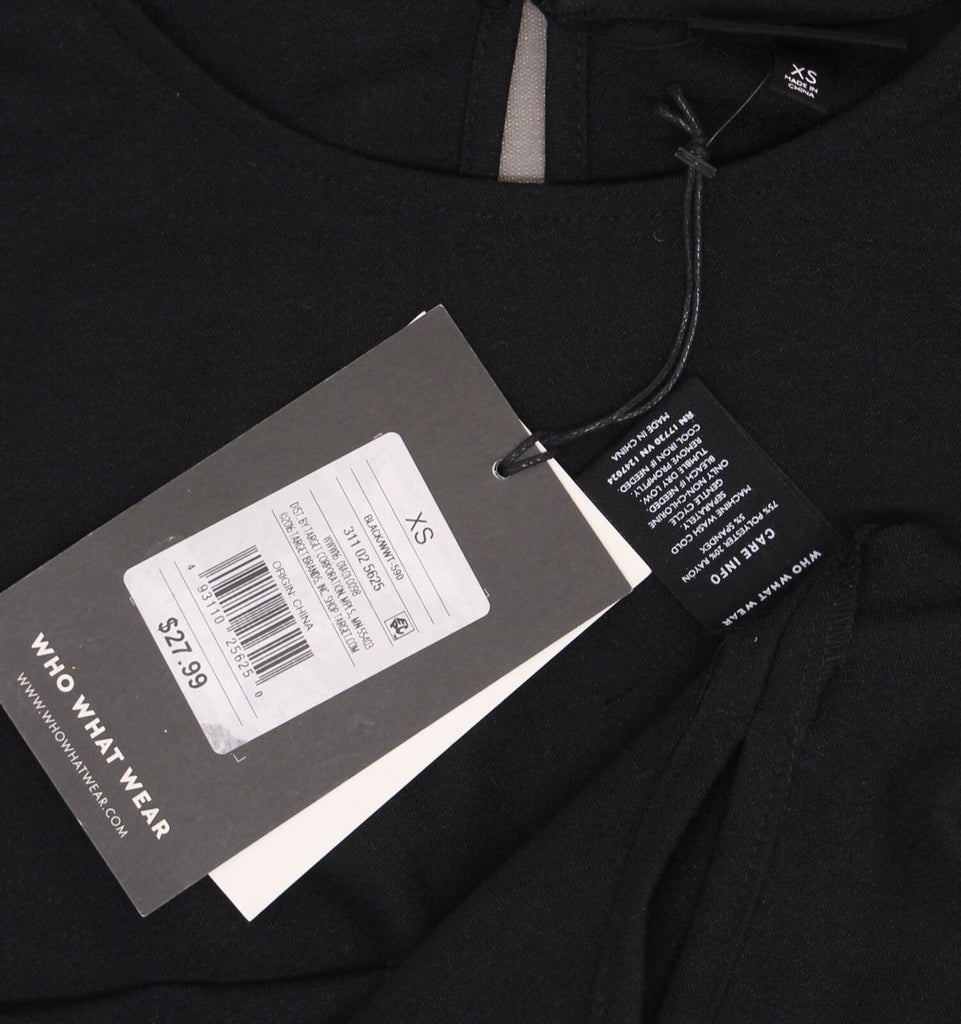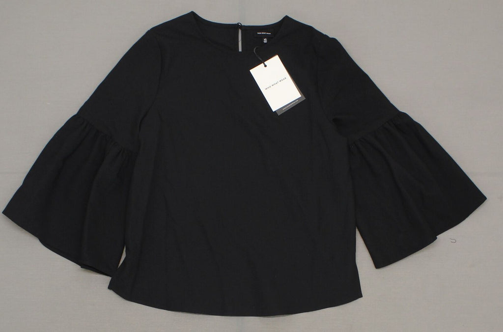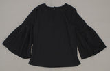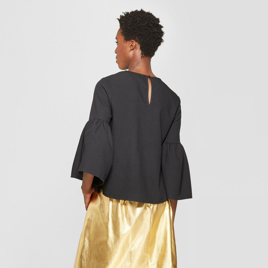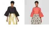 Pullover swing top with lampshade sleeves. Single button back closure.