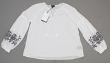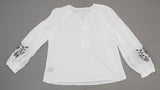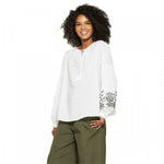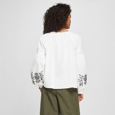 Want a fresh silhouette to update your summer looks? The Embroidered Blouse offers high volume sleeves and a sleek mandarin collar, plus just a hint of billow in the bodice for a cool boho vibe. Adding a softer touch that's popping up all over right now, it's lovely with a flowing skirt and sandals, or adding feminine flow over more structured bottoms.