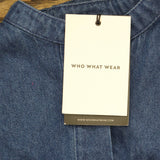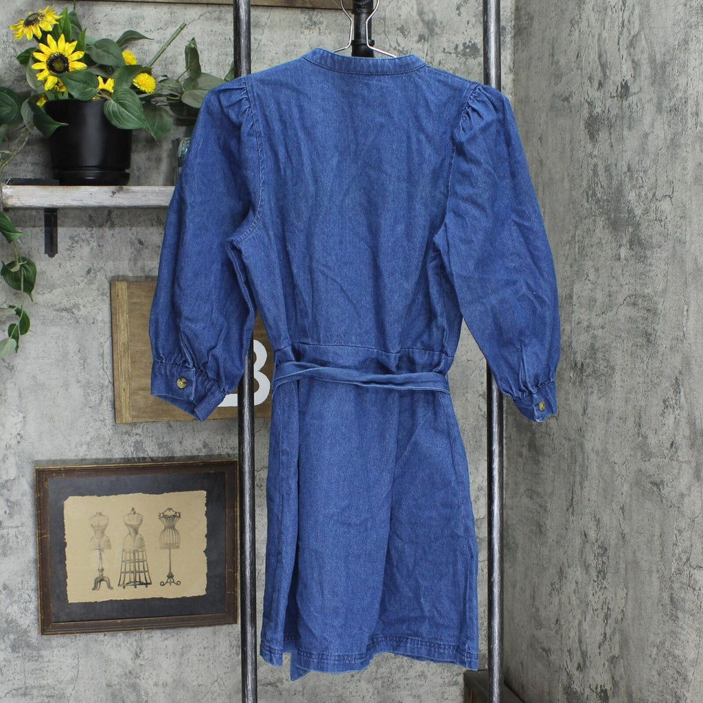Styled in denim for a hint of edgy attitude, the pretty profile gets its distinctive shape from poufed sleeves and a sleek skirt; banded collar, button-down front and patch pockets add menswear-inspired touches.