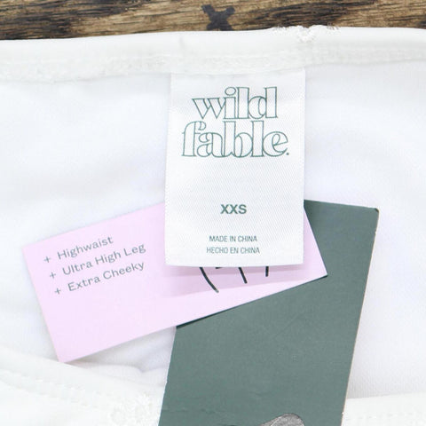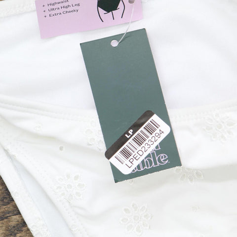 Extra-cheeky bikini bottom from Wild Fable in white with pretty floral eyelet embroidery. Tailored in a high-waist, ultra high-leg silhouette. Made from soft and stretchy fabric with elastic at leg openings for flexible movement in and out of the water. Pull-on style for easy on and off. Wild Fable: A look for every story.