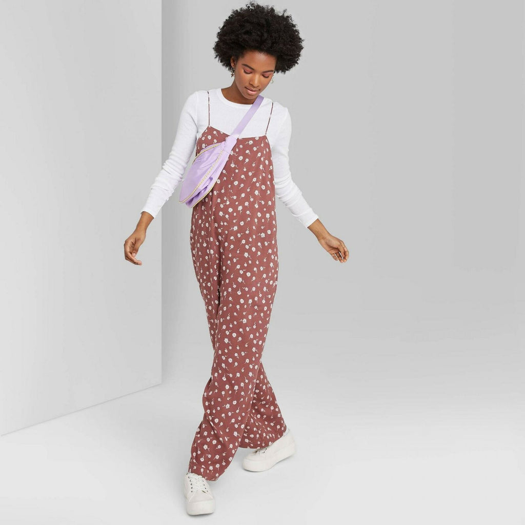 Women's floral-print jumpsuit features a waistless design for a relaxed silhouette. Center seam adds a touch of definition down the bodice, and a strappy back lends extra detail.