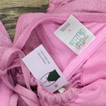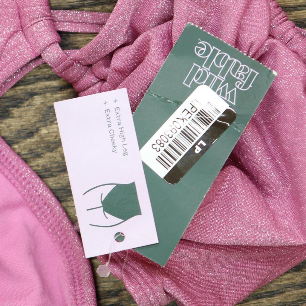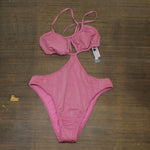 Pink lurex one-piece swimsuit from Wild Fable features a keyhole front, cutout sides along with an extra-high-leg cheeky design. Stretchy fabric construction with removable cups. Crisscross back with adjustable tie provides the perfect fit. Wild Fable: A look for every story.