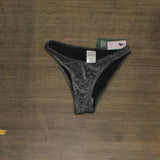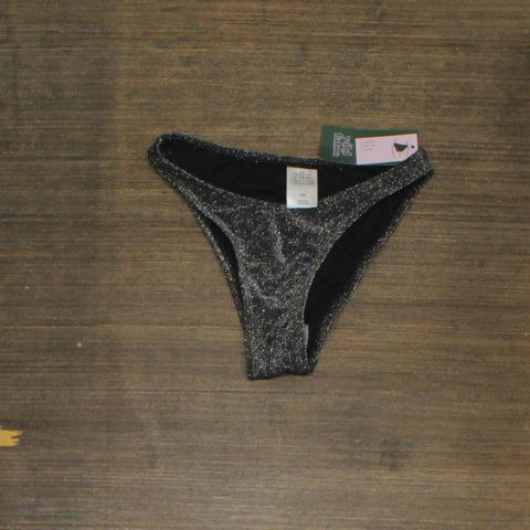 Black lurex bikini bottom from Wild Fable. Made of soft fabric with a blend of metallic fiber and spandex along with full lining. Tailored with a low-rise waist and a high-leg, cheeky silhouette. Pull-on style completes the look with effortless slip-on and take-off. Wild Fable: A look for every story.