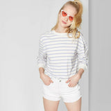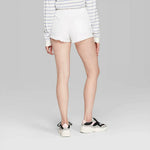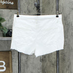 High-waisted jean shorts feature a raw-edge hem. Back and side pockets lend functional flair along with belt loops. Cotton blend offers breathability while front zipper makes for easy wear.