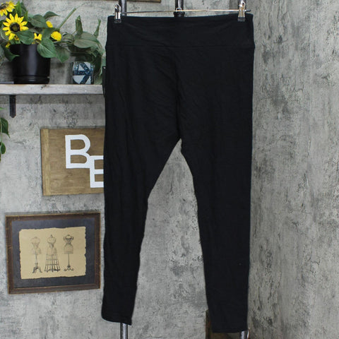 Women's black high-waisted leggings with cotton-blend construction for complete comfort. Wide waistband lends definitive detail along with the full-length design. Full waistband elastic lends additional comfort.