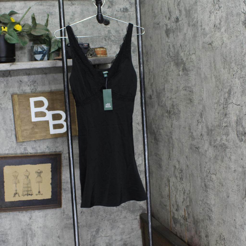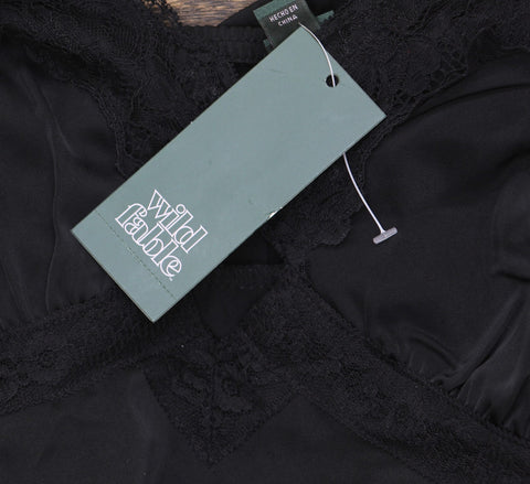 Solid satin slip dress Wild Fable with a deep V-neckline, keyhole cutout and lace trim accents. Made from midweight recycled polyester with spandex and polyester lining for comfy wear that moves with you.