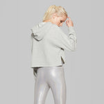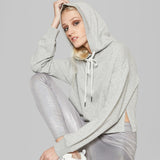 Heather gray long-sleeve sweatshirt made from a cotton-blend fabric cut in a cropped silhouette. Features subtle lurex detailing for a shimmery look, and finished off with drop shoulders and side slits.