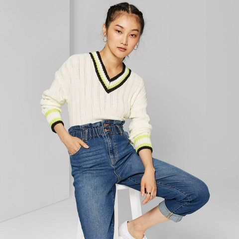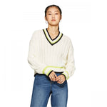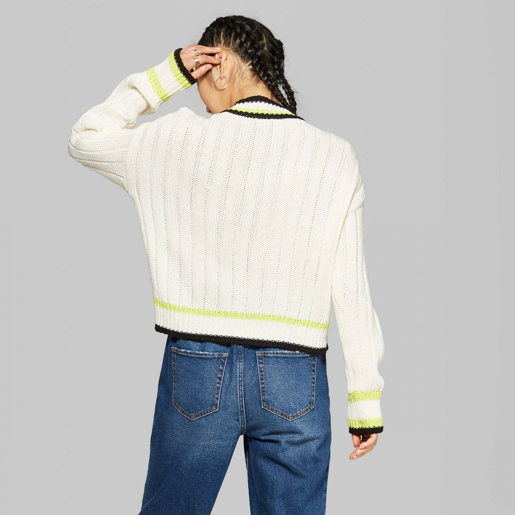 Long-sleeve ivory sweater made from 100% acrylic fabric for comfortable wear and cozy warmth. Features varsity stripes in lime green and black on the cuffs and V-neckline. Cut in a cropped silhouette with a relaxed fit for added comfort.