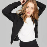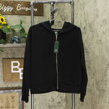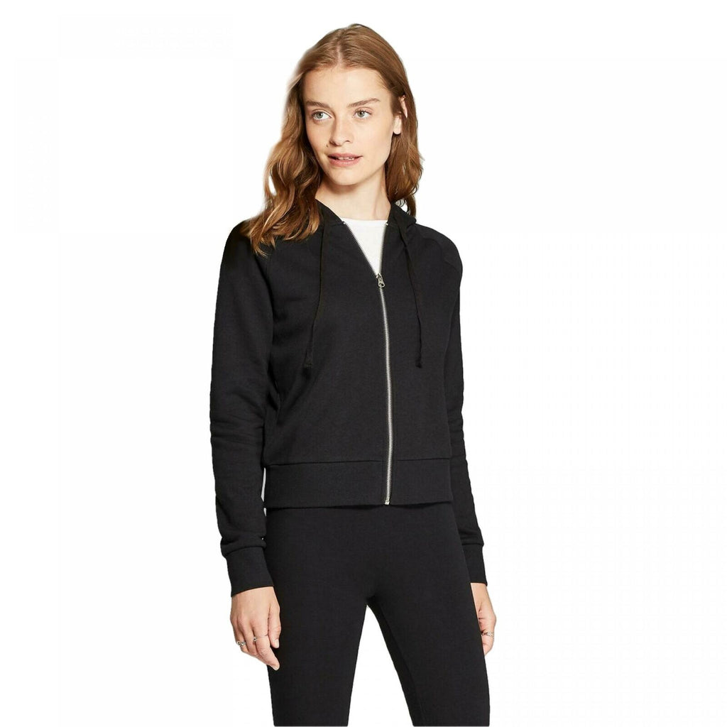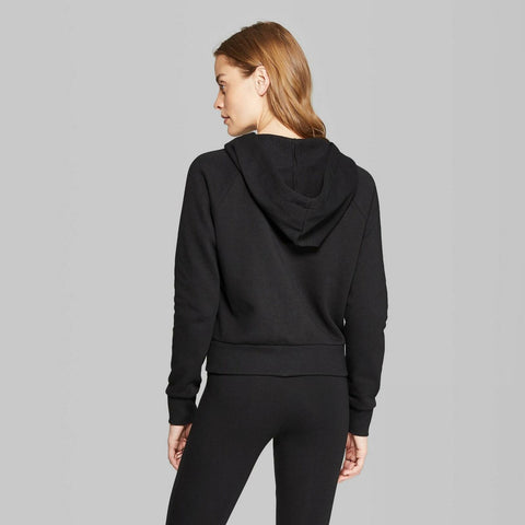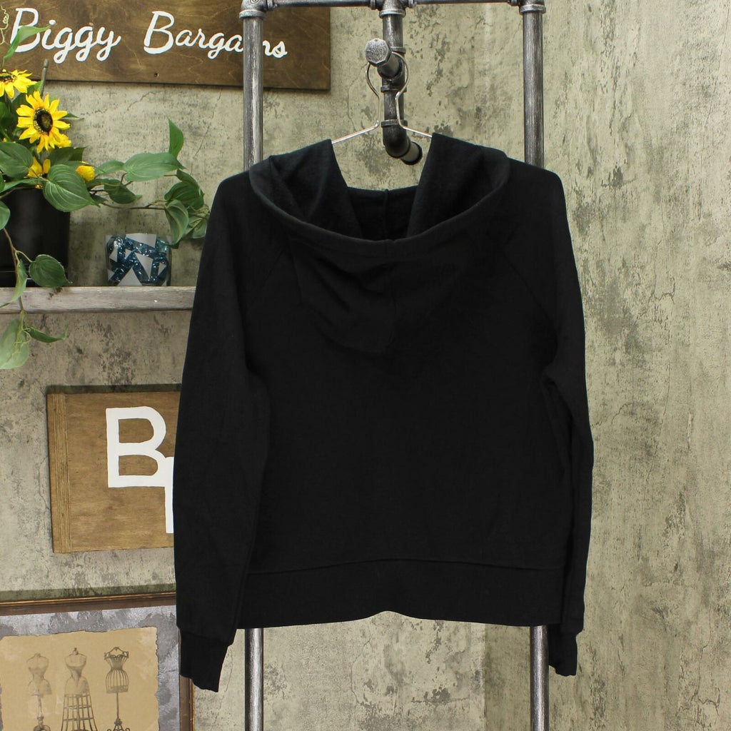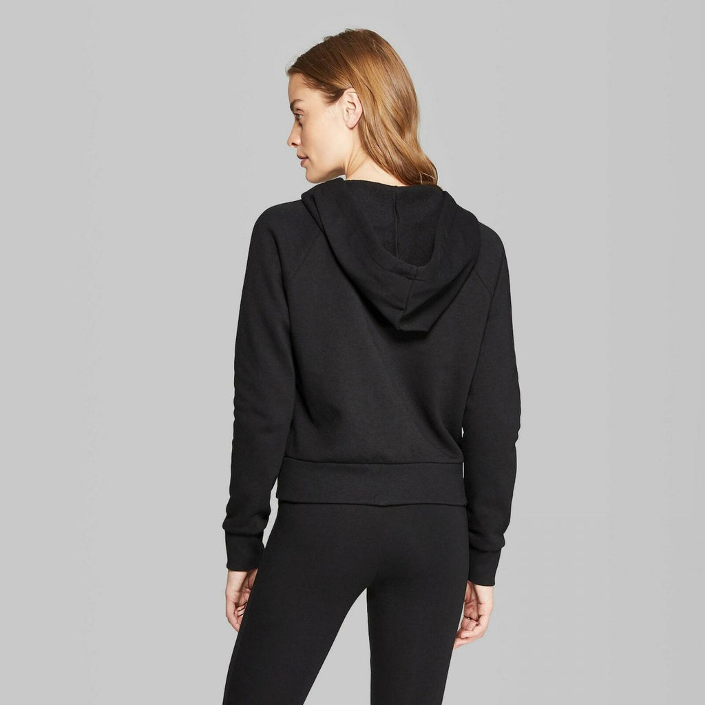 Black zip-up hoodie made from a soft fabric with a fleece construction for comfortable warmth. Cut in a relaxed silhouette with a banded hem and below-waist cut.