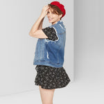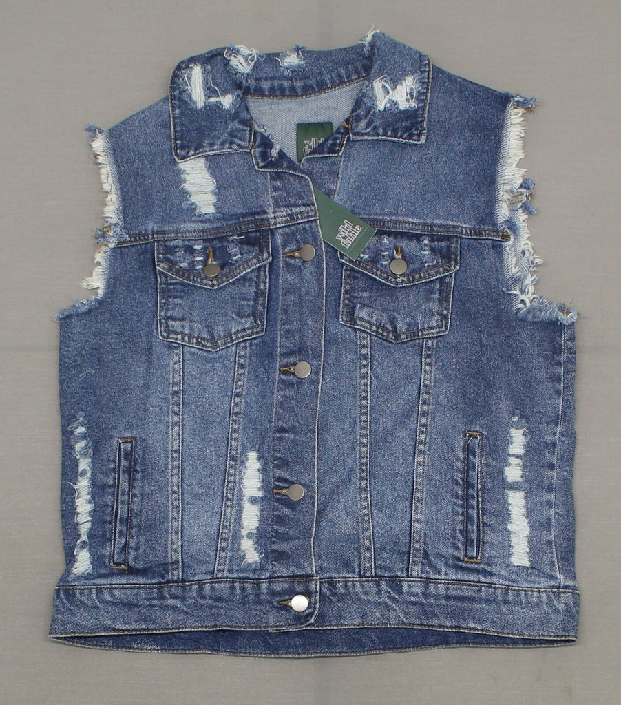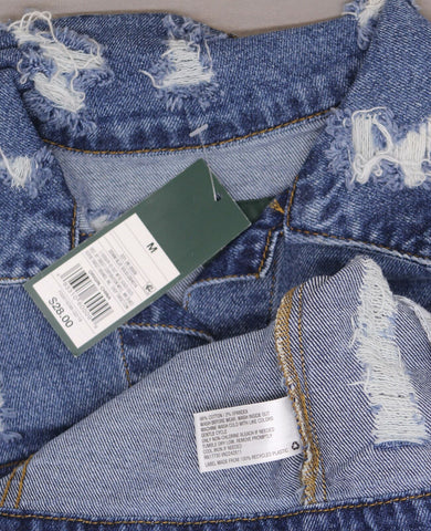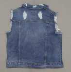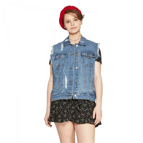 Medium-wash denim vest styled with distressed detailing all throughout for some edge. Made from a cotton-blend fabric and cut in a relaxed fit to provide breathable comfort.