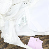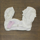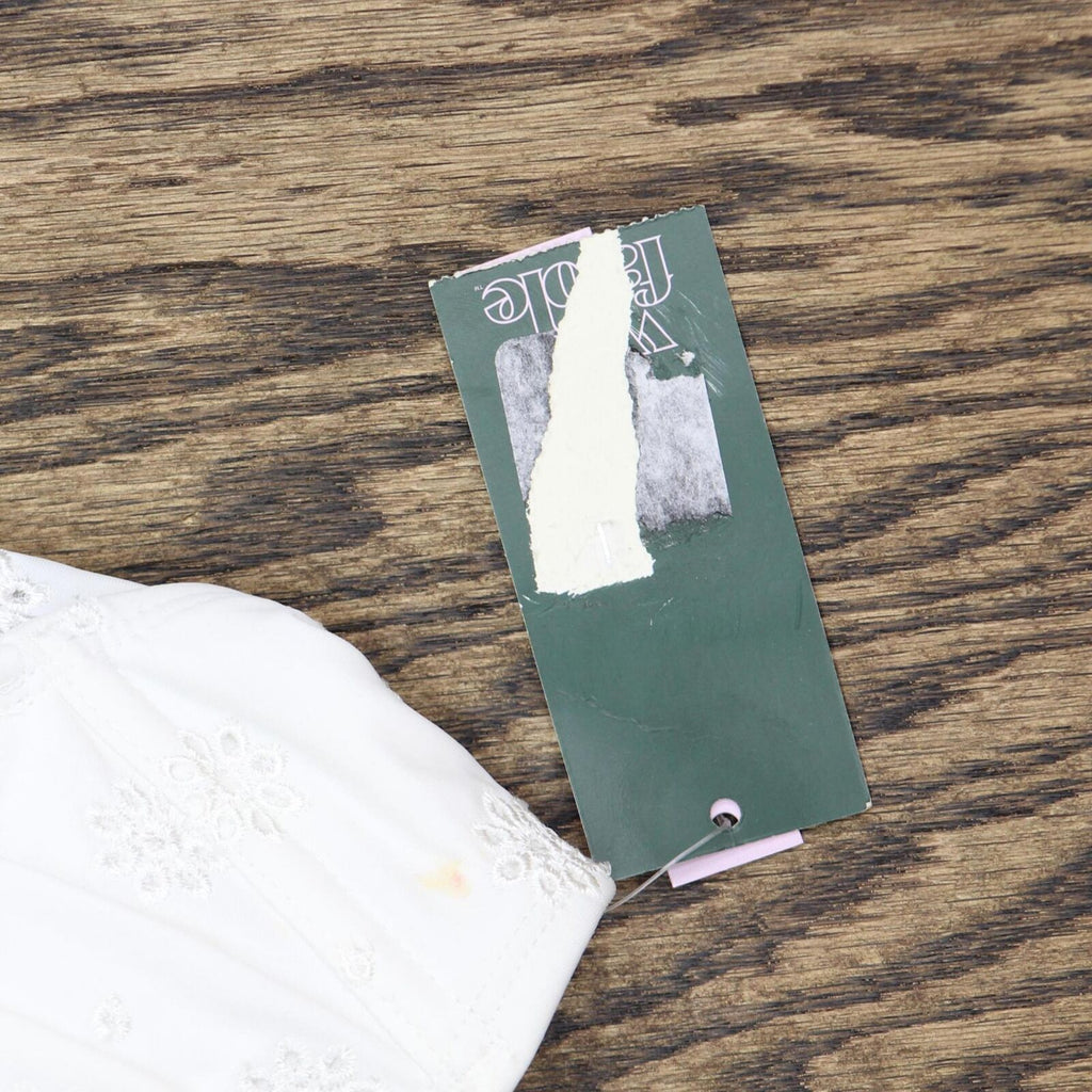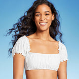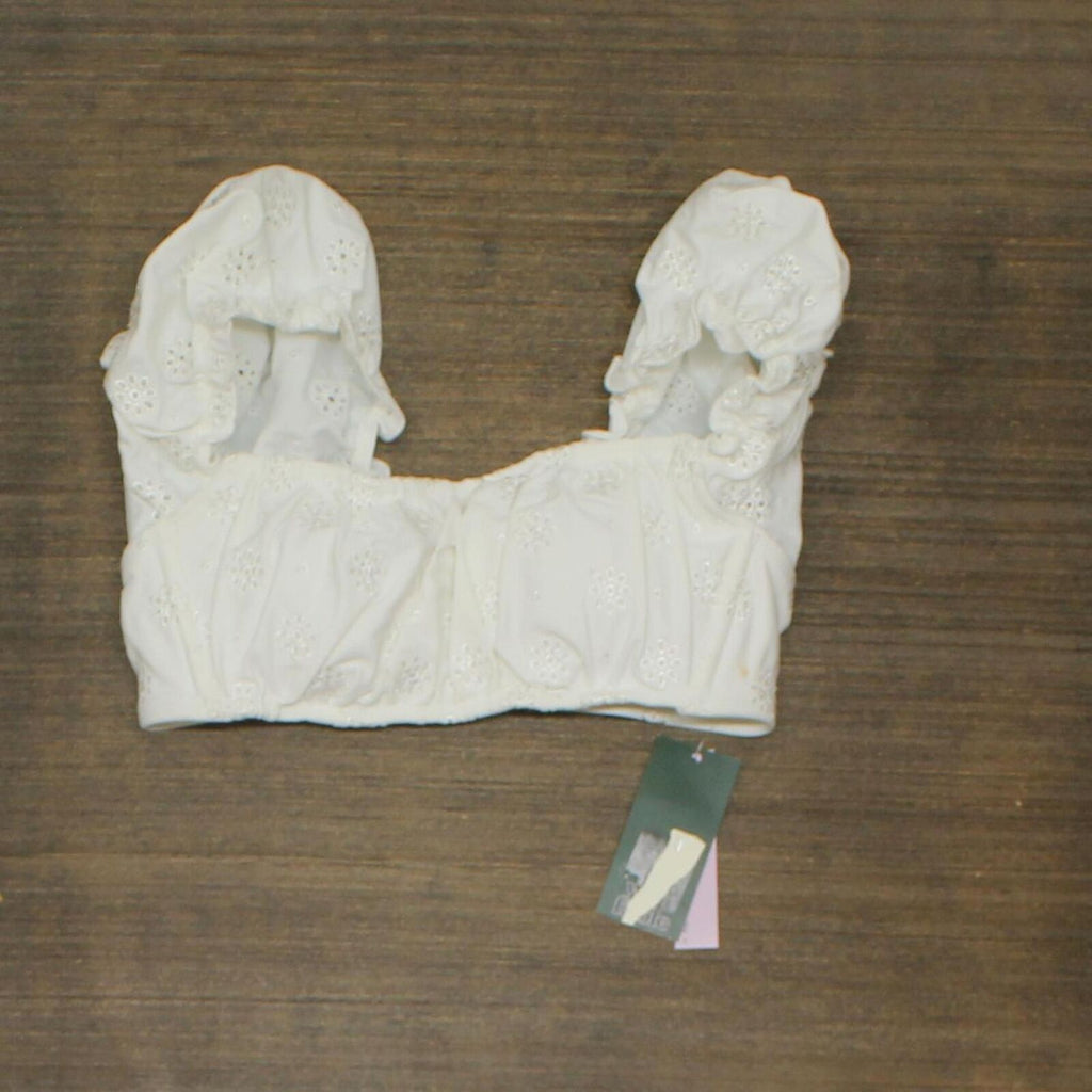 White bralette bikini top from Wild Fable with an eyelet-embroidered pattern. Designed in a bandeau silhouette with short puff sleeves and elastic-cinched ruffles. Made of a soft, stretchy fabric and comfy lining with removable cups. Adjustable strap with back hook-and-loop fastener completes the look. Wild Fable: A look for every story.