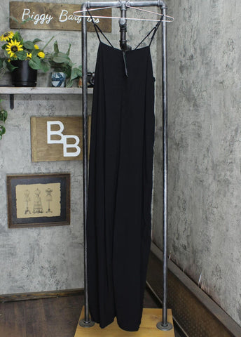 Black jumpsuit features a waistless design for a relaxed silhouette. Center seam adds a touch of definition down the bodice, and a strappy back lends extra detail.