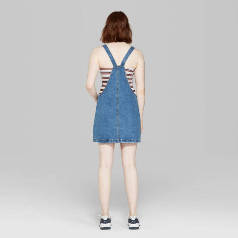 Denim pinafore dress with a medium wash. Cut in a relaxed silhouette with a front zipper that lightly hugs the figure. Features large patch pockets on the sides.