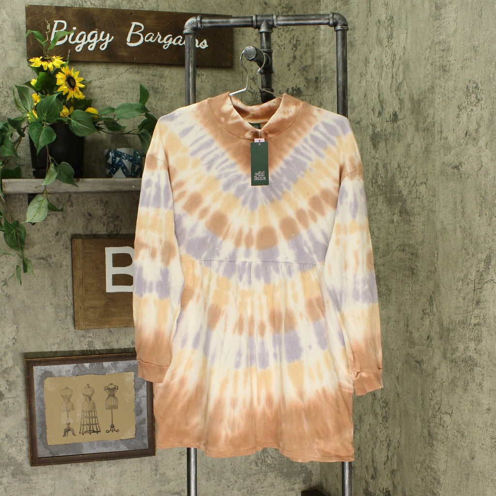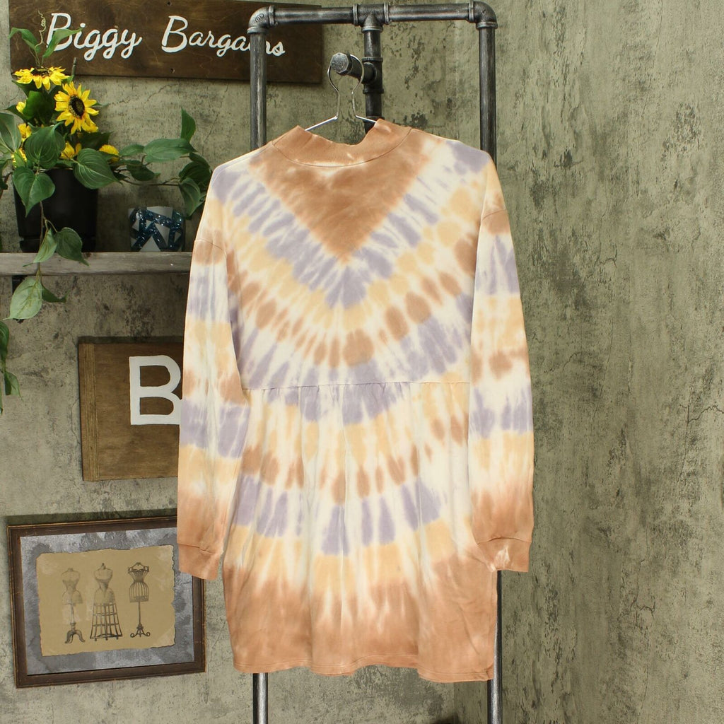 Long-sleeve dress made from 100% cotton fabric for breathable comfort, cut in a flowy silhouette for ease of wear. Fashioned with an allover tie-dye pattern in a pastel color palette. Features a mock neckline, and side pockets complete the look.