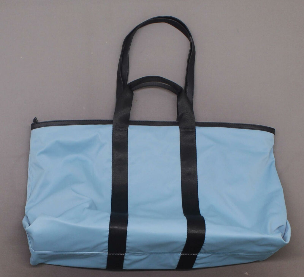 Large weekender bag in teal blue, made from a lightweight yet durable material for ease of carrying and long-lasting use. Fitted with four handles for versatile carrying, and a full-zip closure that opens up to a spacious interior.