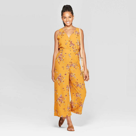 Update your casualwear collection with the colorful style of this Floral-Print Sleeveless V-Neck Side-Button Jumpsuit from Xhilaration . This sleeveless V-neck jumpsuit features a red and white floral print against a vibrant yellow backdrop, creating an eye-catching aesthetic that looks great with a variety of footwear and accessories helping you create a fun, on-trend look you're sure to love. Designed with a wrap V-neckline and a side-button waist, plus a wide-leg construction for added appeal, this colorful floral jumpsuit gives you a casual-chic wardrobe choice perfect for a variety of stylish occasions.