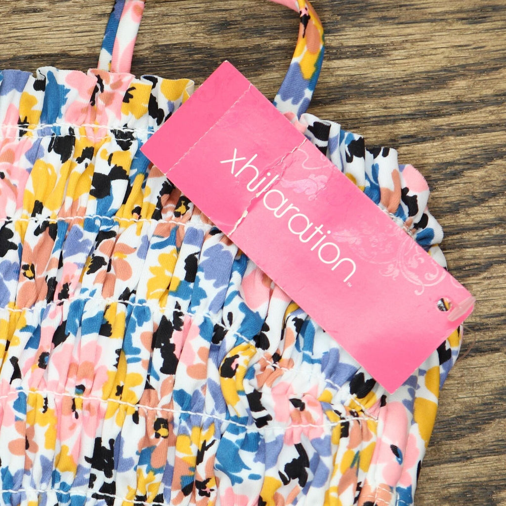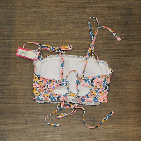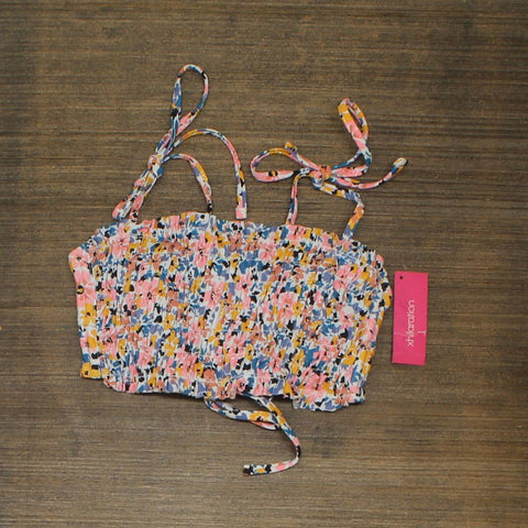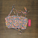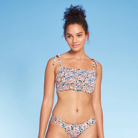 Freshen up your swimwear wardrobe with the Smocked Bandeau Bikini Top from Xhilaration. This lovely bandeau bikini top has multicolor flowers blooming throughout for vibrant flair, and it features a smocked front that creates a shirred look for a fun pop of texture. Ties at each shoulder and at the back help achieve the perfect level of support and fit, while the crisscross accents at the back add a playfully flirty appeal. This floral bikini top will pair perfectly with matching floral bottoms, or you can wear it with solid-colored bikini bottoms to let the flowers pop.