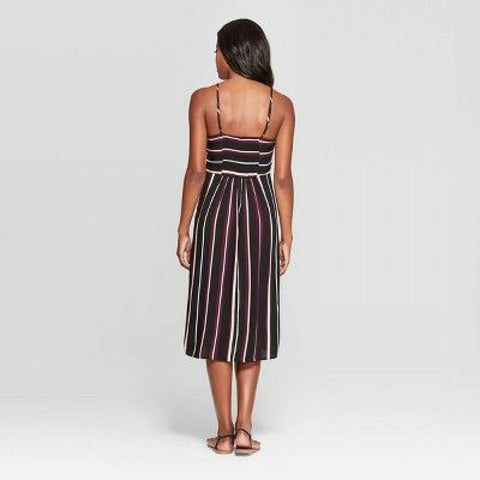 Add chic flair to your warm-weather closet with this simply stunning Striped Sleeveless Square-Neck Side-Button Midi Dress from Xhilaration. Crafted from a soft and lightweight fabric, this striped midi dress sports sleek shoulder straps and fine multicolored stripes all over. The fitted bodice sports a play of horizontal stripes that contrasts perfectly with the vertical stripes on the skirt for a pleasing aesthetic, while the high side slit and button detailing add sassy flair to the whole. Pair with platform sneakers when it's warm, then take into cooler weather with a moto jacket, ankle boots and tights.