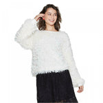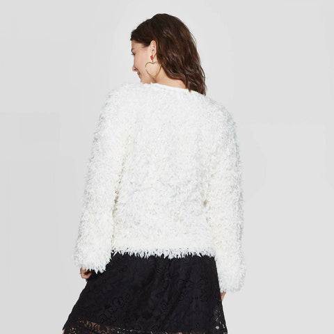 Bring a little character to your attire with the Long-Sleeve Crewneck Feather Yarn Pullover from Xhilaration. This women's long-sleeve sweatshirt features a feathery design in a cream hue for a cute look that you will love. It’s made from durable fabric to ensure long-lasting use and optimal comfort, and sports a pullover design for easy transitions into other outfits. Wear this white sweater over a black lace dress and pair with black lace-up boots for an on-trend look that is perfect for a night on the town with the girls.
