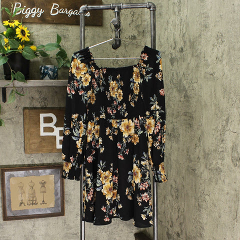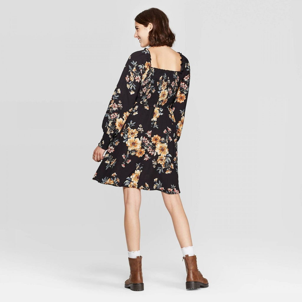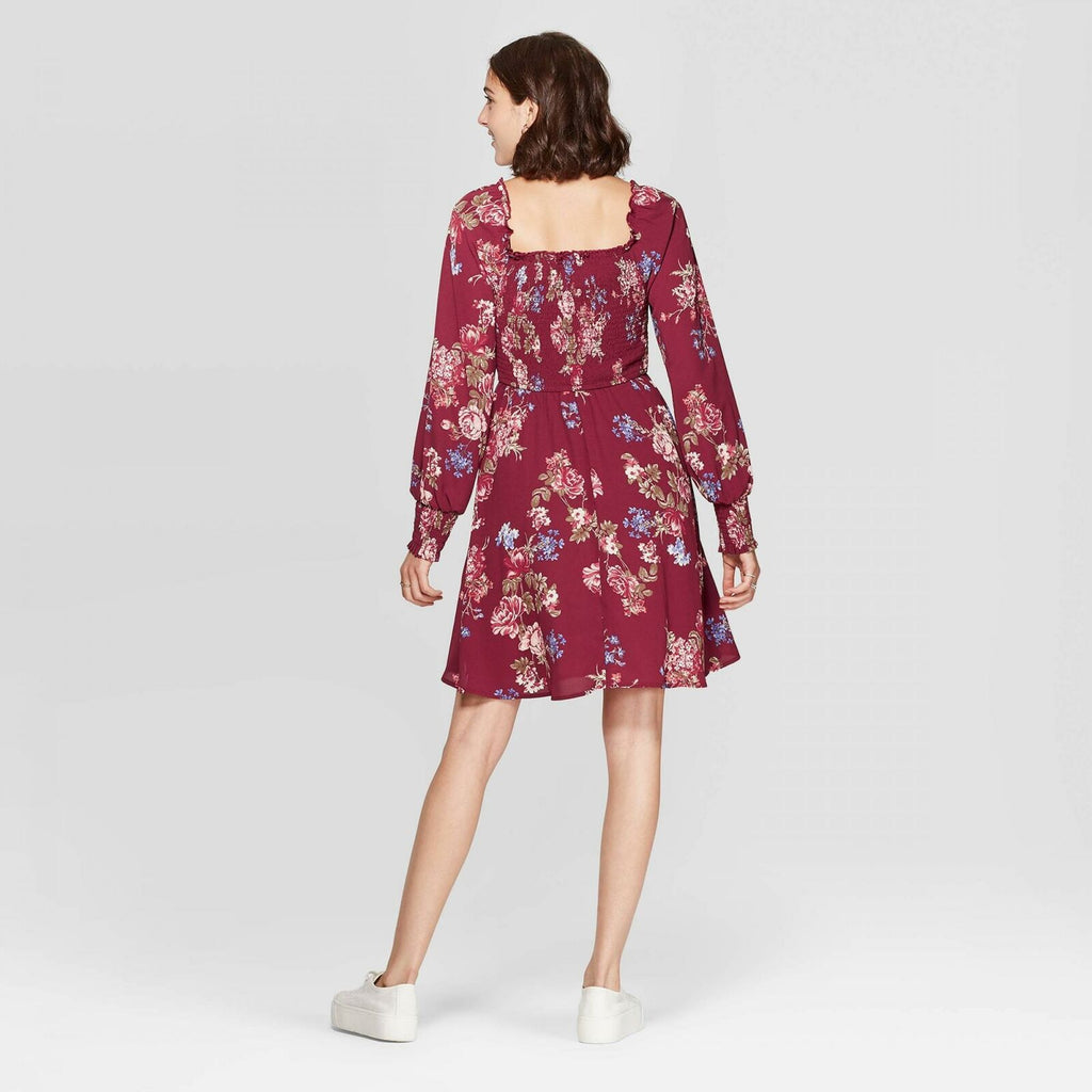 Bring a feminine chic update to your closet with this Floral-Print Long-Sleeve Square-Neck Smocked Top Mini Dress from Xhilaration. Featuring an allover floral print against a solid backdrop, this printed long-sleeve dress makes for a simply charming look. A square-neck design on both the back and front with smocked detailing on the yoke and cuffs offers a touch of flattering femininity. The floral mini dress also showcases a soft and breezy silhouette, creating a flowy look that'll swish gracefully with every step you take. Add some strappy flats and drop earrings for a casual daytime look, or put on a fashion jacket with a chic handbag for a semi-formal look you’re sure to love stepping out in.