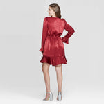 Style yourself a flattering look with a dose of shimmer and shine with the Long-Sleeve Deep V-Neck Lace-Trim Satin Wrap Mini Dress from Xhilaration. Designed in a lovely wrap silhouette and sporting a shiny finish, this burgundy satin dress sports a surplice V-neckline accented with dainty lace trim, statement long sleeves with bell cuffs, and waistline with shirred back and side ties for added shape and style. The ruffled trim runs the entire hemline and front wrap to complement the flared trim of the sleeves for a pulled-together look.