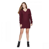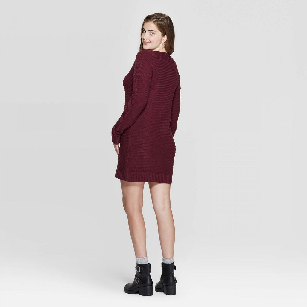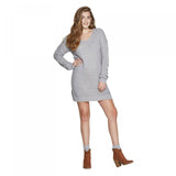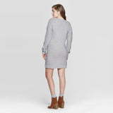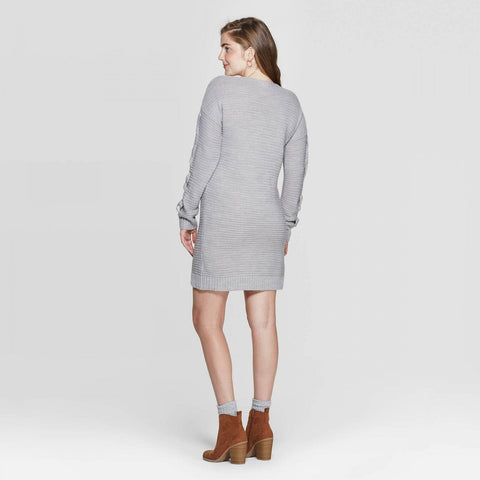 Switch from fall to winter looks with ease with this chic and stylish Long-Sleeve V-Neck Lace-Up Sleeve Sweater Mini Dress from Xhilaration to spruce up your cool-weather closet. Crafted in a soft gray hue with a horizontal rib-knit pattern all over, this long-sleeve knit sweater mini dress lends cool, laid-back flair to your casualwear. The banded hem and cuffs ensure a snug and cozy fit. The soft slouchy construction and sleek V-neck add a chic, contemporary look to this fun ensemble, while crisscross detailing along the sleeves completes the look. Pair with contrasting solid-color or printed leggings, a wool scarf and knee-high boots in blustery weather.
