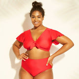 Get standout style this swim season with the Tie-Front Cap-Sleeve Bralette Bikini Top from Xhilaration. This bright red bikini top features a V-neckline embellished with a tie on the front of the bust, and the top is finished with fluttery cap sleeves for a unique twist. A scoop cutout accentuates the back of this vibrant top, and two hook-and-loop closures provide a secure, comfortable fit. Wear it with high-waisted bikini bottoms to rock a little retro flair, or pair it with black or printed hipster bottoms to flaunt your own unique style.