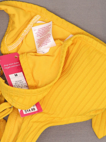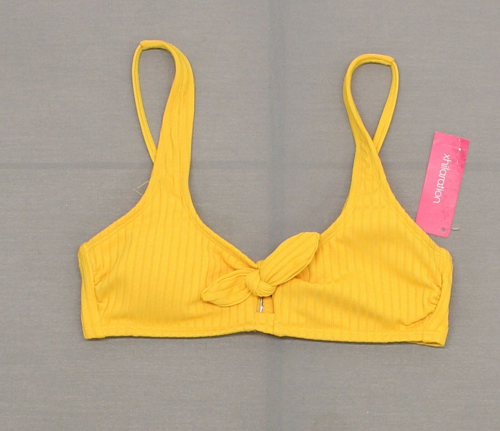 You'll be hitting the beach in style with this Ribbed Cut-Out Tie-Front Bralette Bikini Top from Xhilaration. This bikini top has a classic bralette design with adjustable straps and a fastener at the back. The ribbed material mixed with the front bunny tie and cutout will elevate your swim look, making this a swim top you reach for again and again.