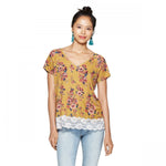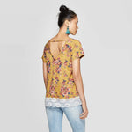 Combine sweet style with comfy wear with this V-Neck Floral Lace Trim T-Shirt from Xhilaration. Made from a lightweight fabric with added spandex for comfy all-day wear, this short-sleeve V-neck tee will instantly become one of your go-to wardrobe basics. Sporting a V-neckline with a horizontal strap at the back, and a sweet floral lace trim applique at the hem, the charming design of this printed T-shirt comes to life with the help of bright florals against a solid background. Keep your style as chic as ever by pairing it with your favorite pair of jeans and flats for an easy day out.