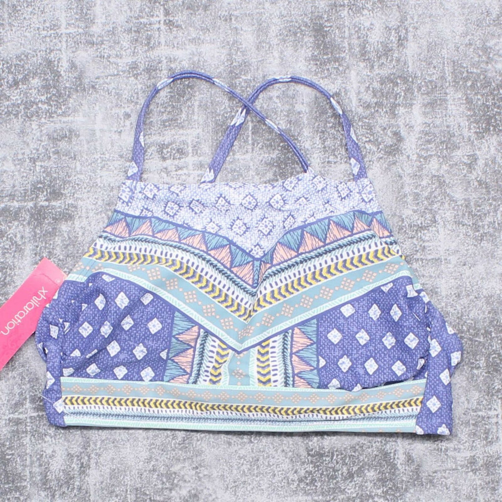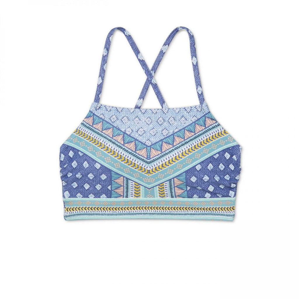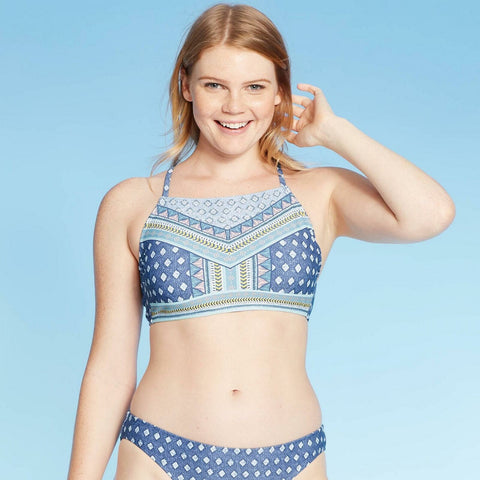 Beach style goes boho chic in the Square-Neck High-Neck Bikini Top from Xhilaration. This printed swim top is made from a lightweight, opaque fabric with added spandex to keep you nice and comfortable throughout your sunny adventures. Cast in a soothing palette of blue, green, pink, yellow and white hues, this statement bikini top is adorned with a lively print, and it features a square, high neckline with thin straps that crisscross and tie at the back for added support and style. Create a perfectly coordinated look with the matching bikini bottoms, or mix with other bottoms in your swimwear collection for a unique look.