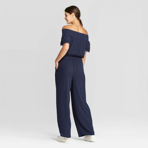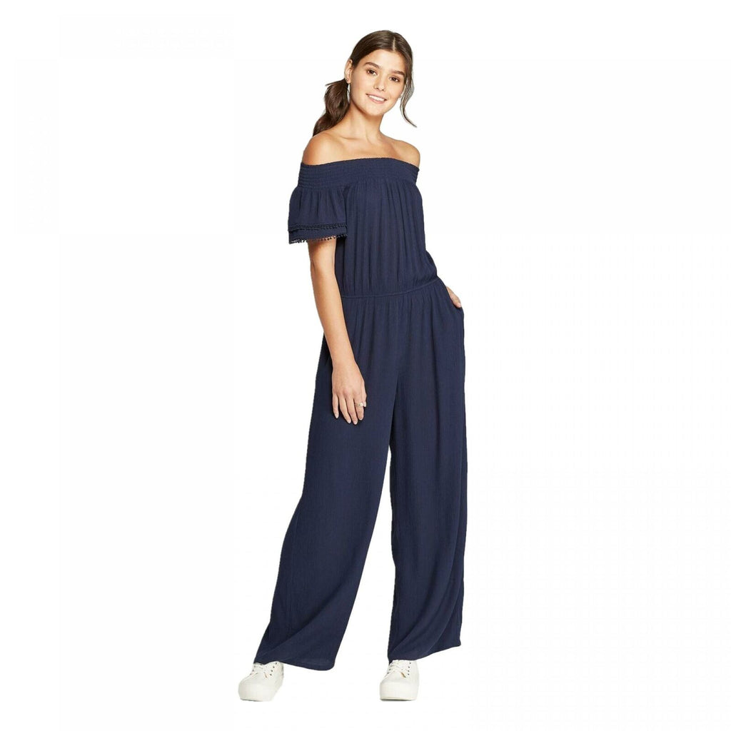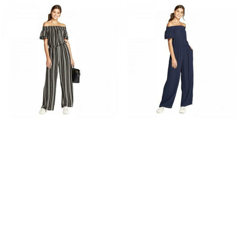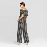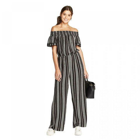 The Striped Short-Sleeve Off-the-Shoulder Jumpsuit from Xhilaration adds casual-cool vibes to your wardrobe. Adorned with vertical stripes in white, the black jumpsuit features a wide-leg silhouette for comfy movement and an off-shoulder cut with smocked detailing on the neckline. The short tiered sleeves are trimmed with pompoms for a breezy, warm-weather look. Made from gauzy fabric, this jumpsuit exudes fashionable grab-and-go appeal, and it's perfect to wear with sandals or sneakers for versatile styling.