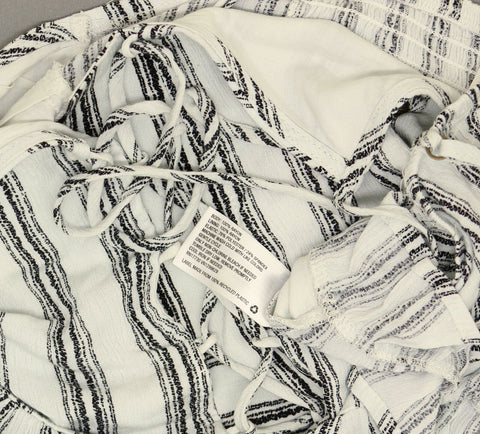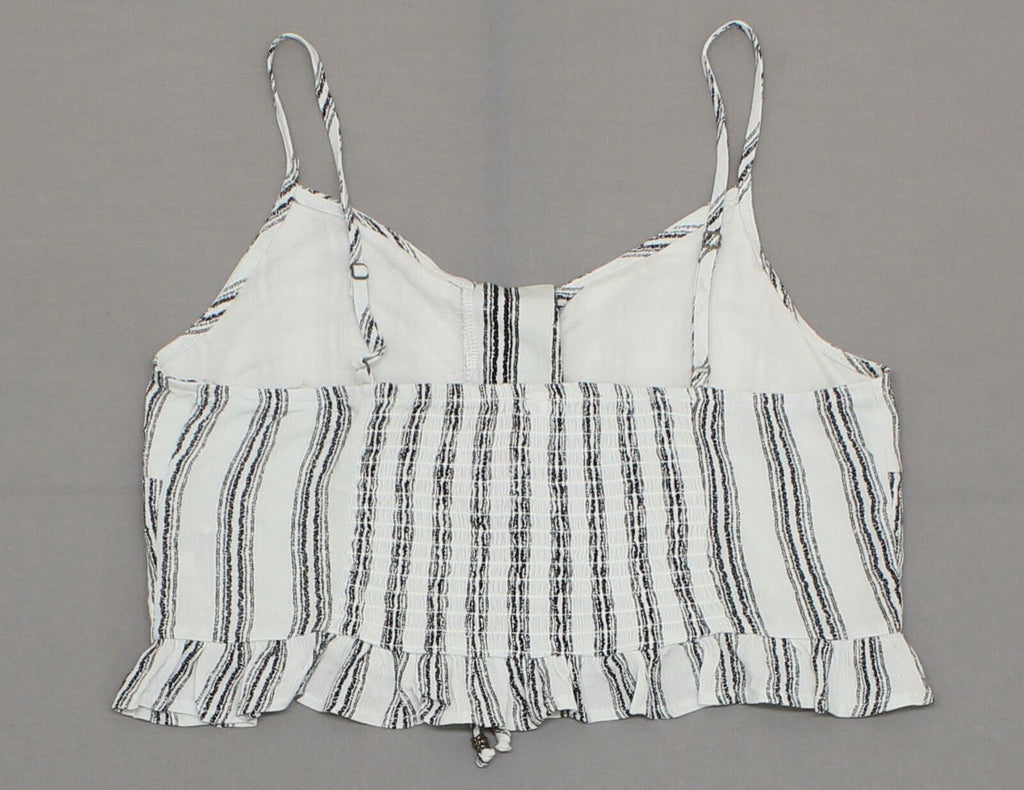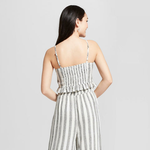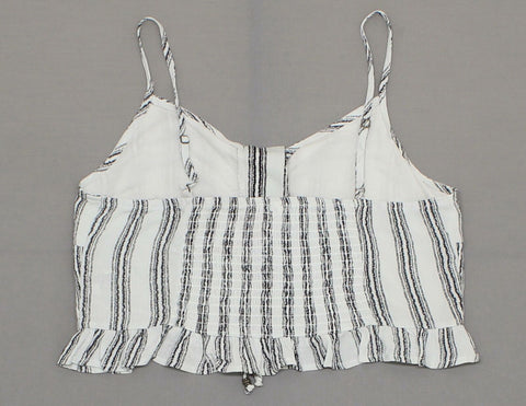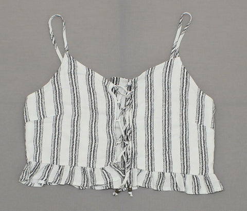 A ruffle bottom and lace up front adorn this striped cropped tank. A smocked back and adjustable straps ensure the right fit.